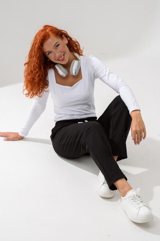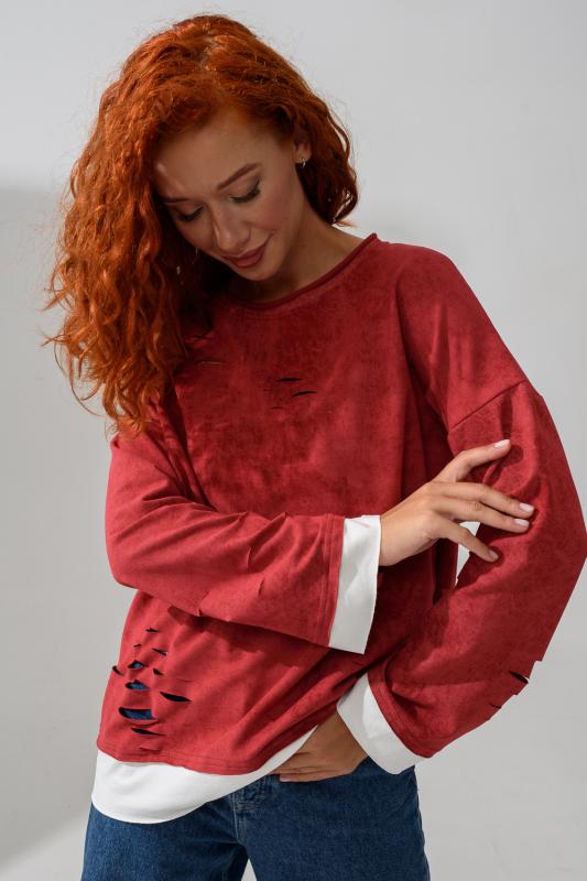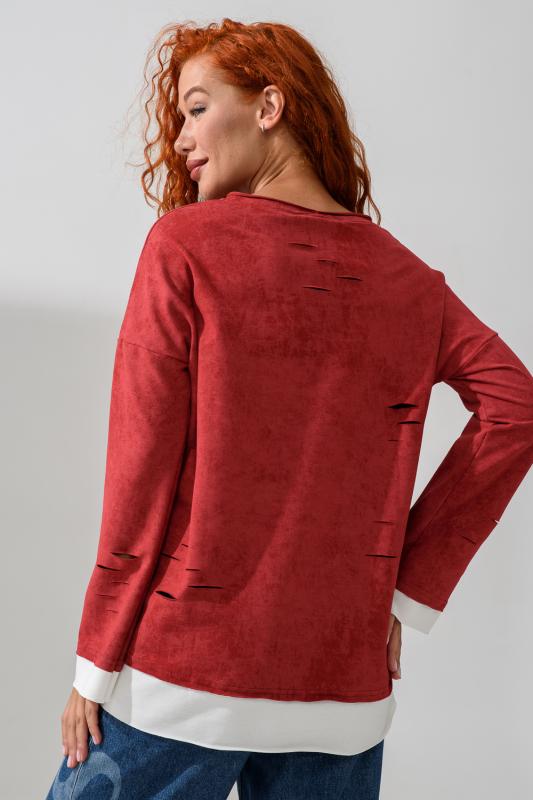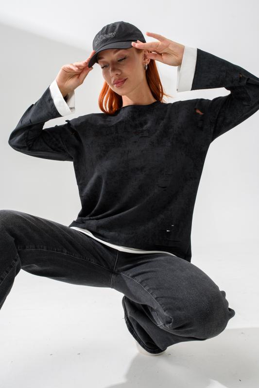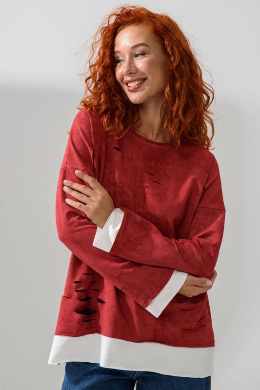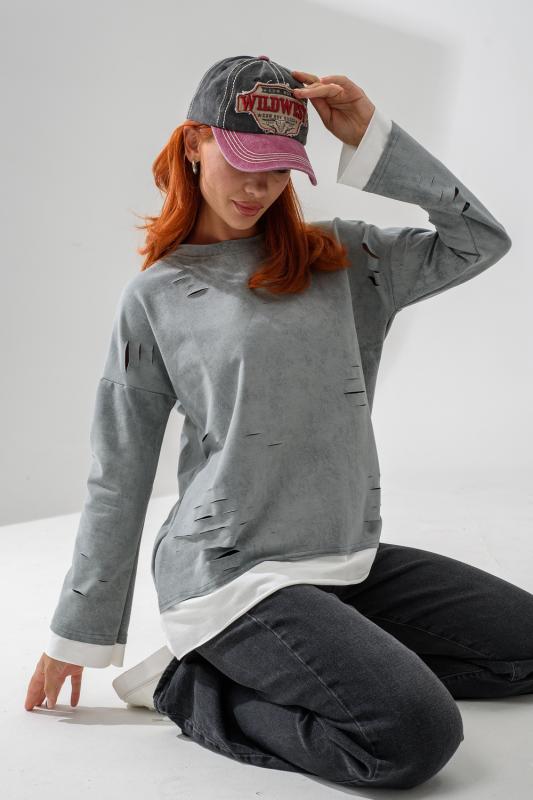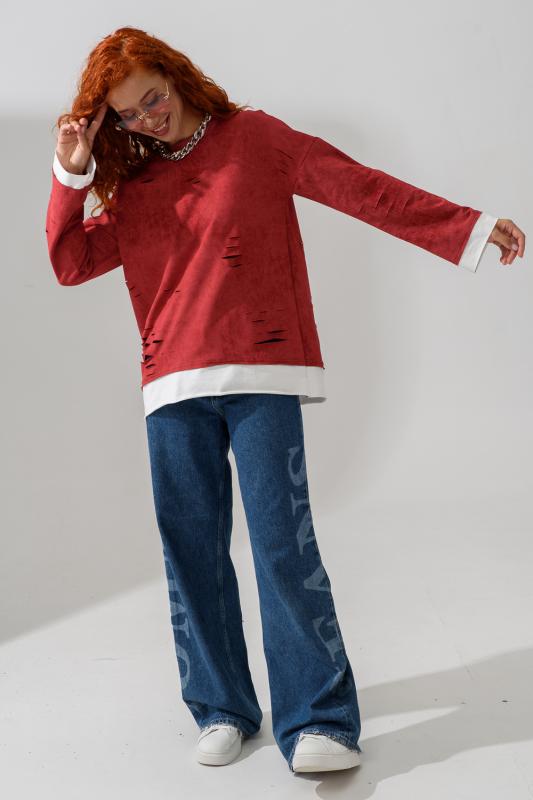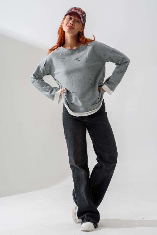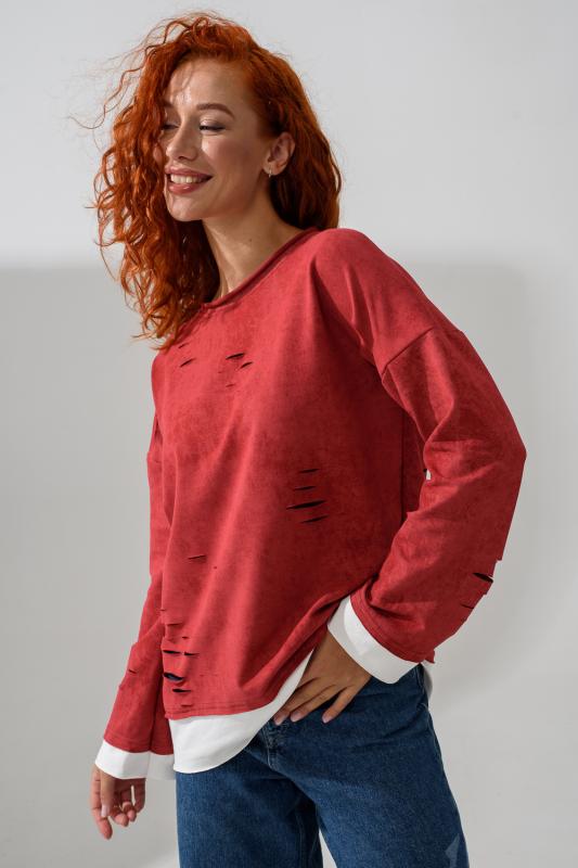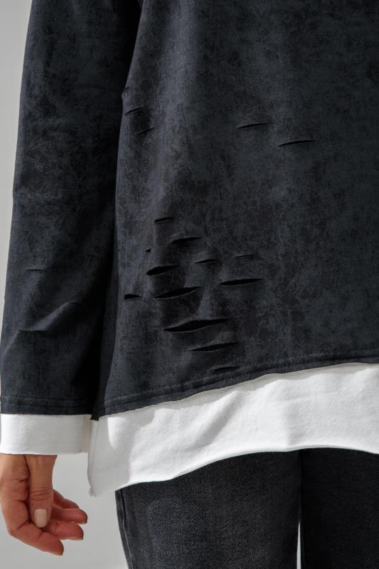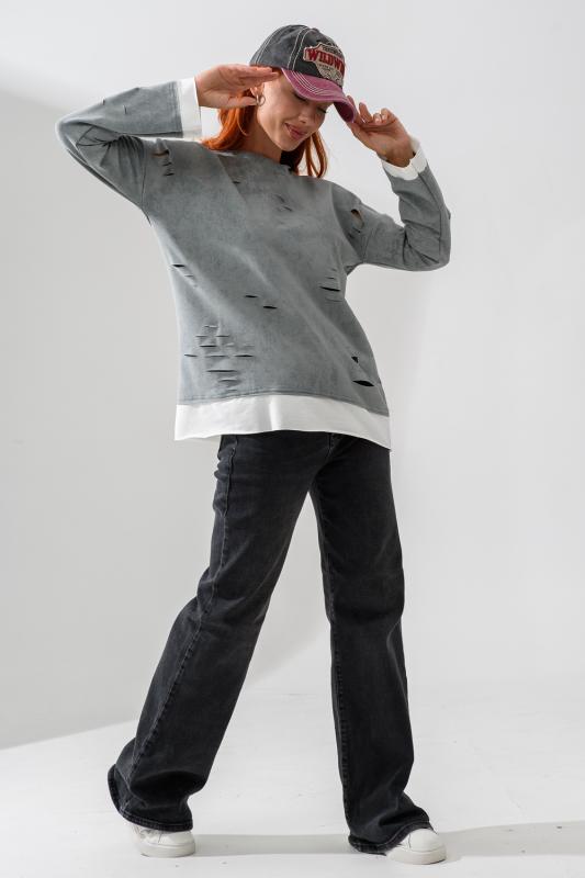 Женский лонгслив свободного кроя - эксклюзивная разработка с эффектом второго слоя. Очень современный дизайн! Особое внимание уделено деталям: необработанная горловина, края рукавов и низа, эффект многослойности придает изделию современный минимализм.