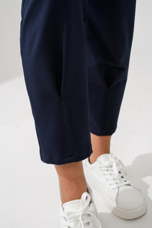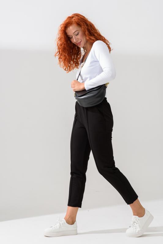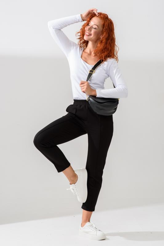 Классические женские брюки бананы имеют эластичный пояс на резинке, боковые карманы с отрезным бочком, элегантную прострочку по центру штанин, которая визуально удлиняет ноги. Благодаря высокой посадке легкие брючки помогают создать женственный силуэт. Строгие укороченные бриджи не скатываются и не линяют, держат форму и не мнутся, а колени не вытягиваются даже спустя время.