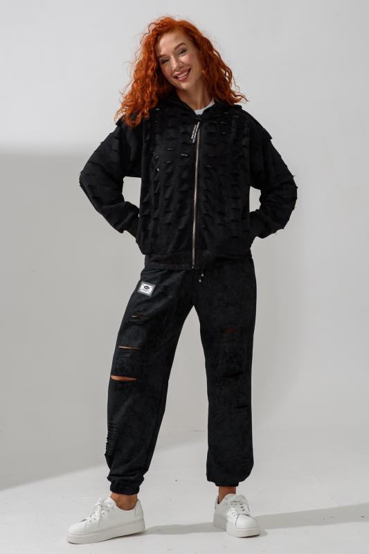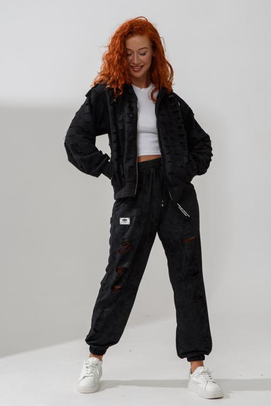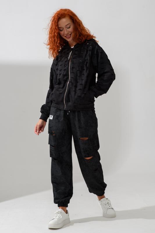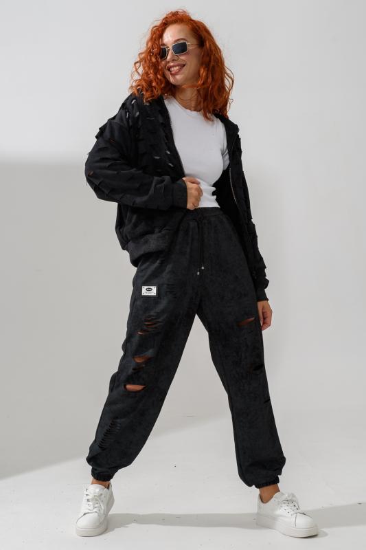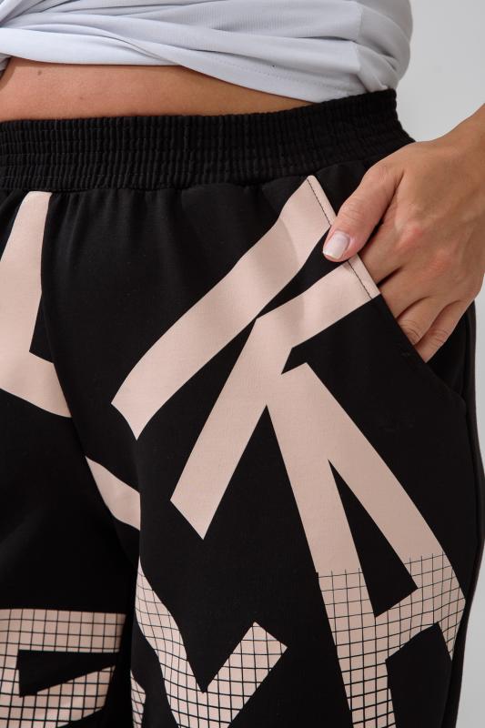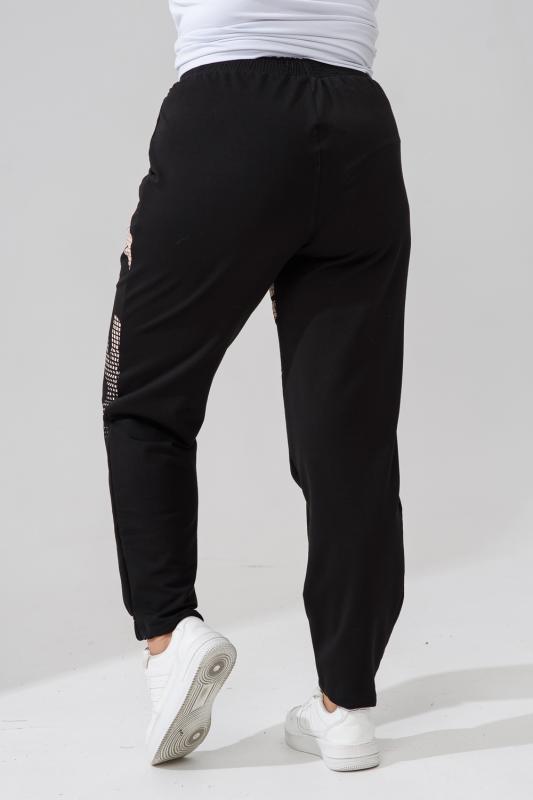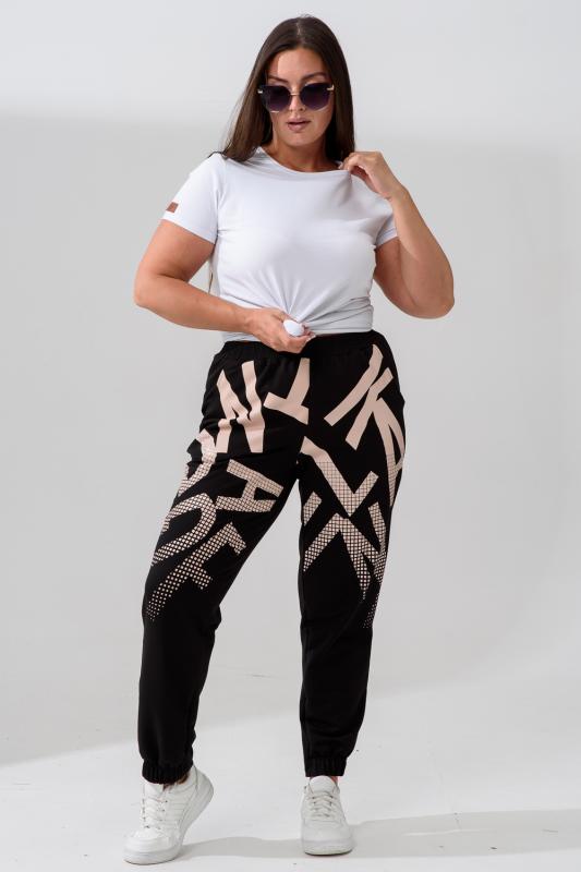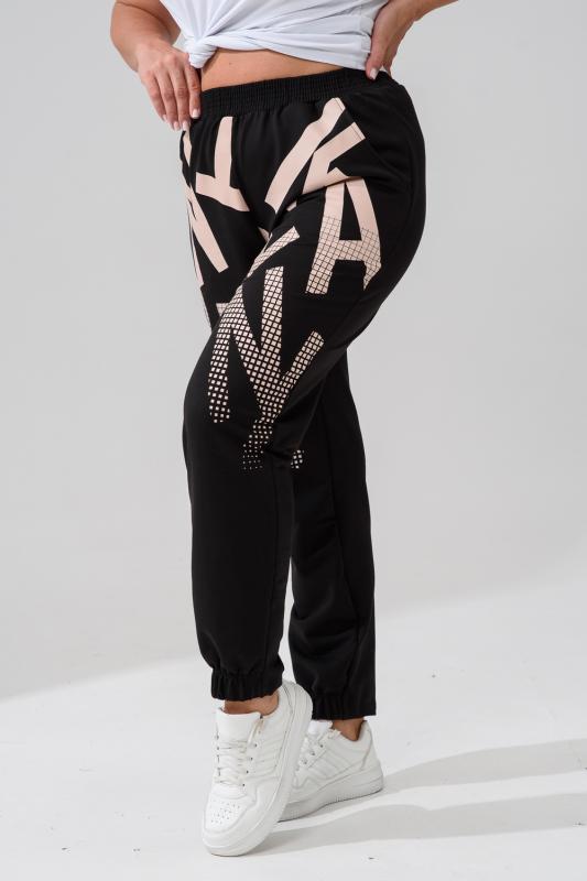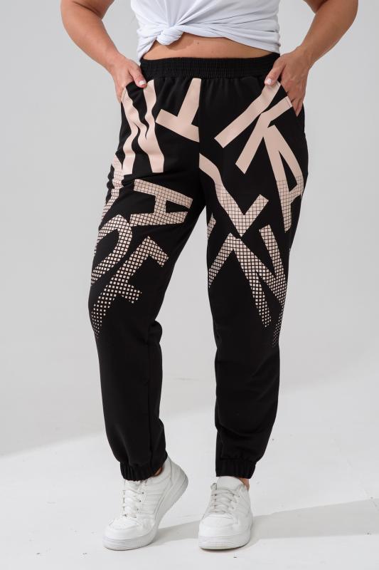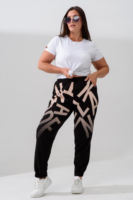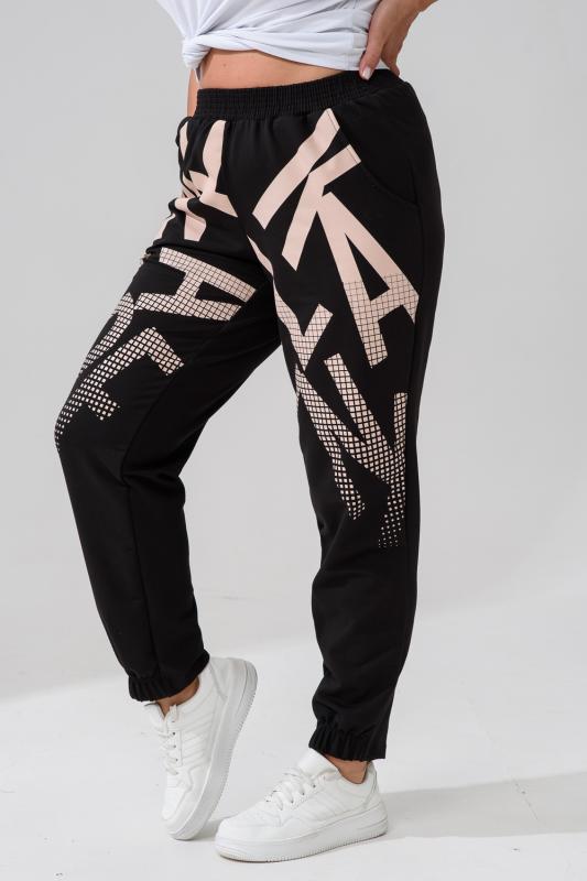 Брюки женские, свободные по бедрам, зауженные к низу. Спереди внутренние карманы, низ передней части брюк собран на эластичную ленту. Пояс выполнен на многоигольной машине. На передней и задней частях брюк принт. Идеальны для повседневной носки.