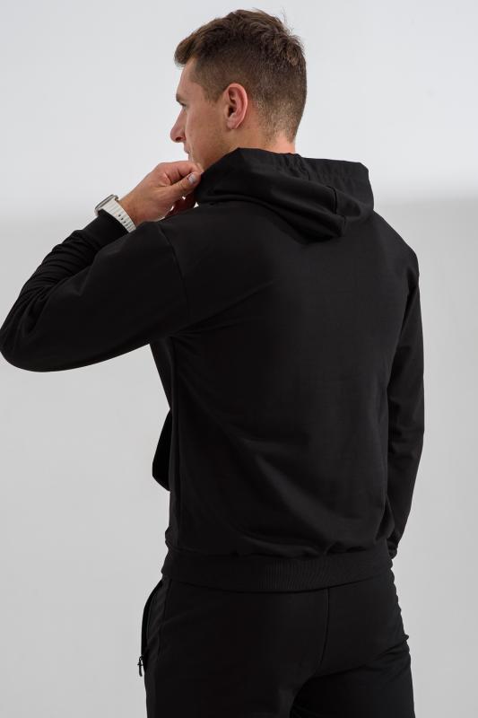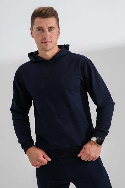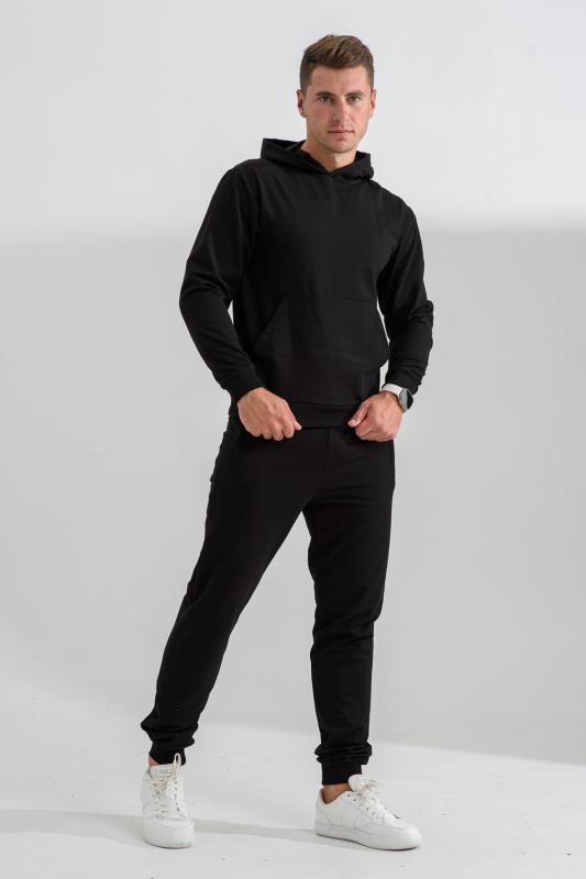 Костюм спортивный мужской с худи и джоггерами. Костюм свободного кроя состоит из толстовки с капюшоном и карманом кенгуру и брюк джоггеров на манжете с карманами в боковых швах. Костюм однотонный сшит из качественного хлопкового трикотажного материала - футера 2-х нитки. Обладает отличной эластичностью, не сковывает движений. Идеален для занятий спортом. Зимой костюм возможно носить в тренажерный зал или использовать как домашнюю одежду.