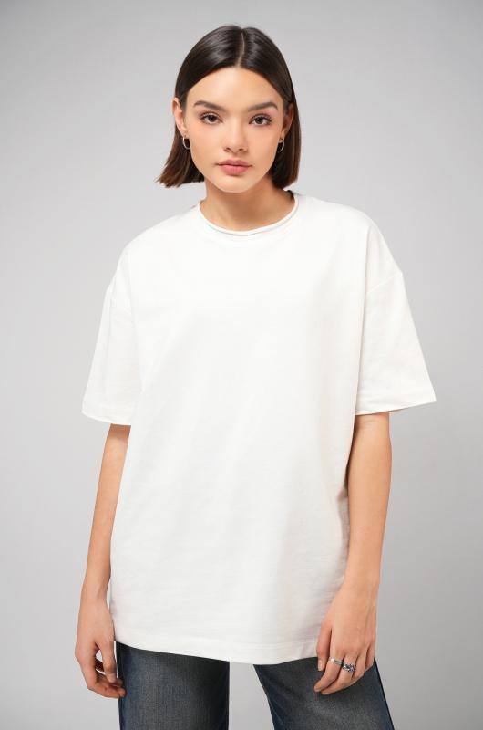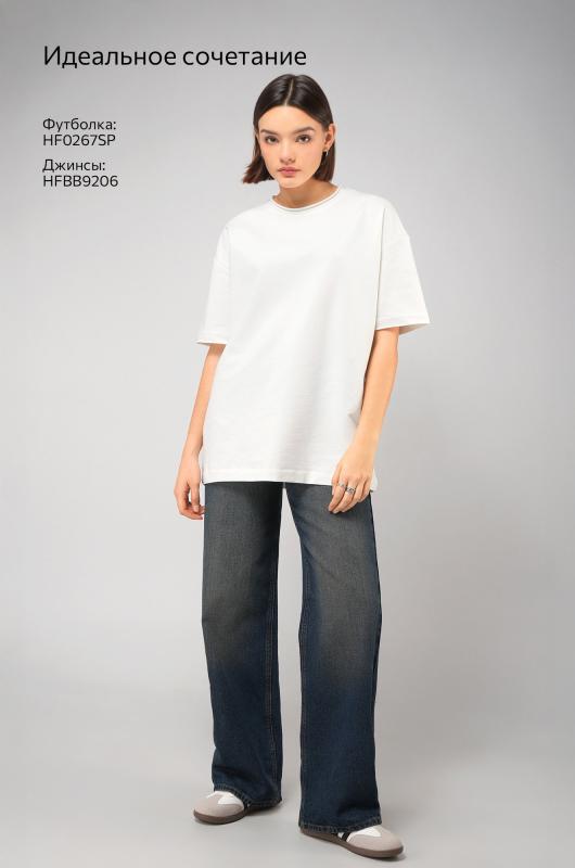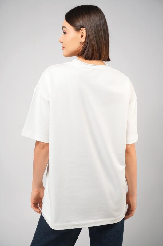 Женская футболка белого цвета выполнена в популярном стиле оверсайз. Её свободный крой со спущенным плечом создаёт расслабленный силуэт. Особый шарм трикотажной модели придает нарочито необработанный край горловины.