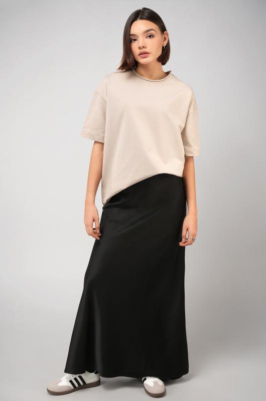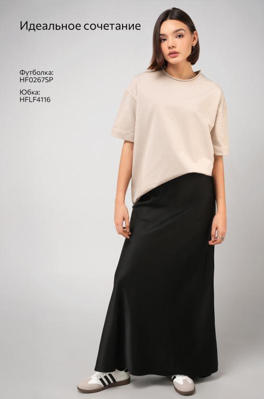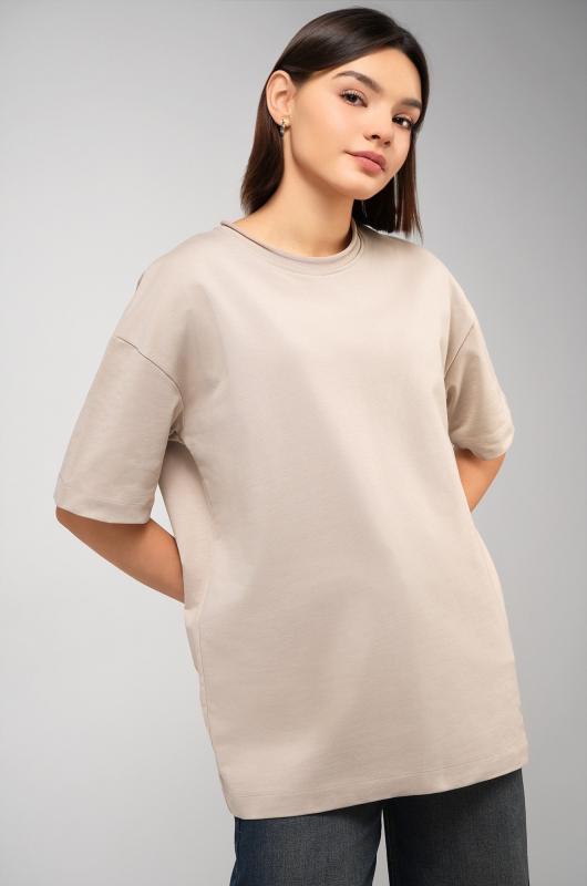 Женская футболка светло-бежевого цвета выполнена в популярном стиле оверсайз. Её свободный крой со спущенным плечом создаёт расслабленный силуэт. Особый шарм трикотажной модели придает нарочито необработанный край горловины.