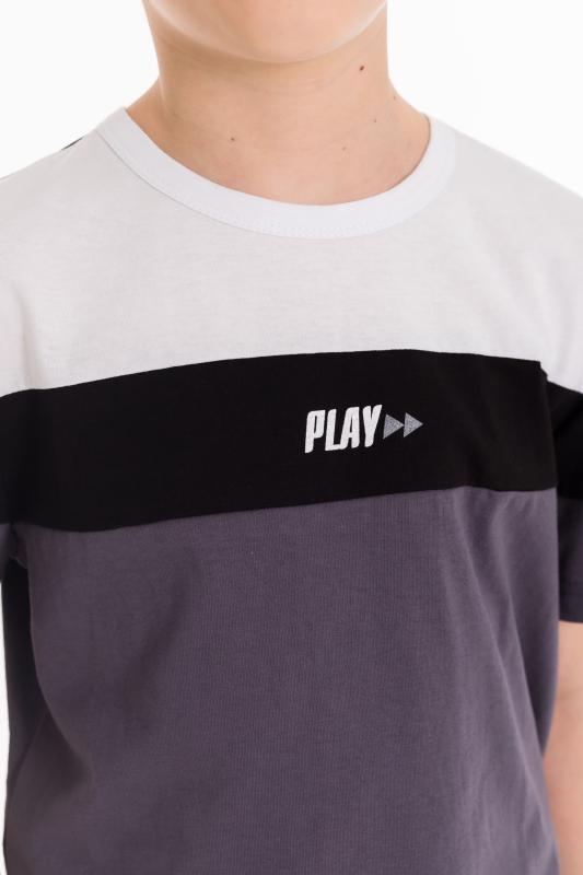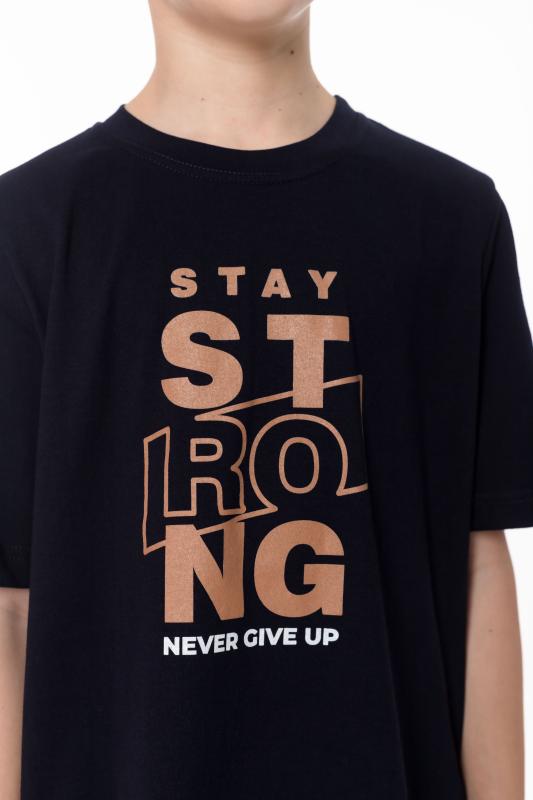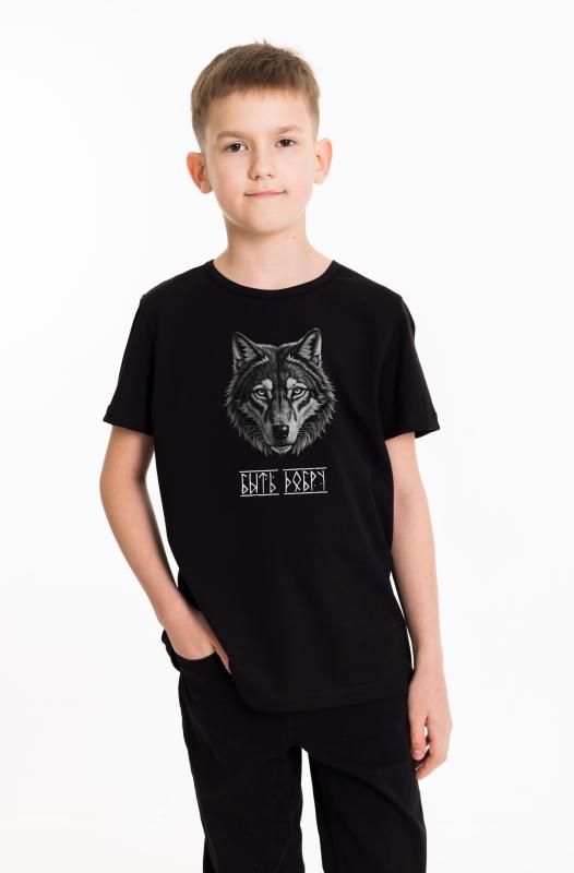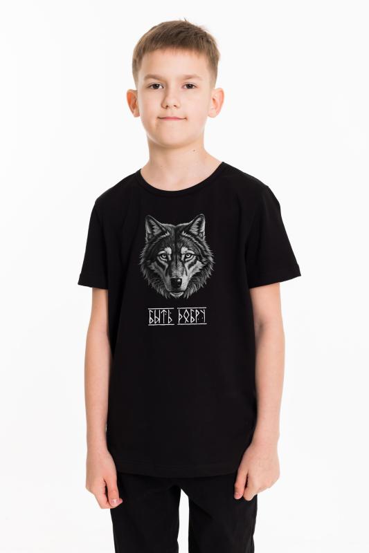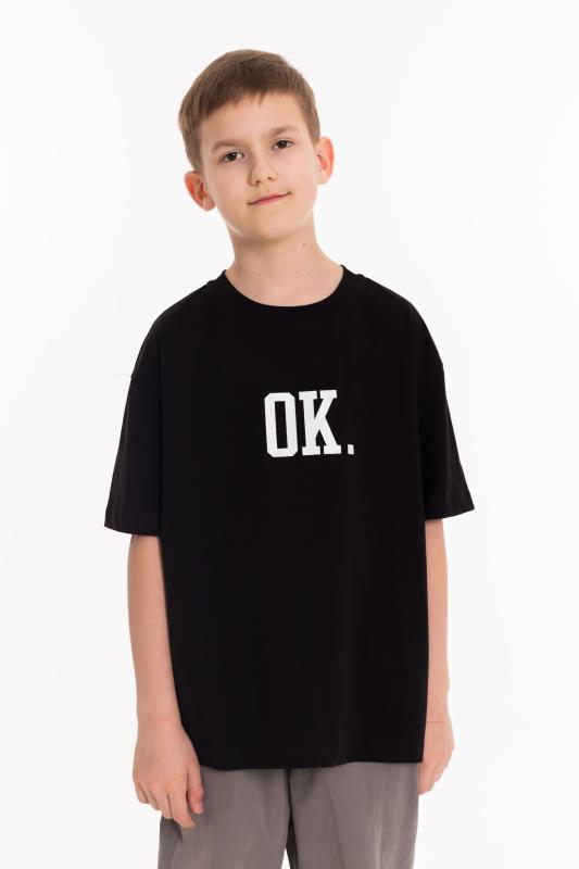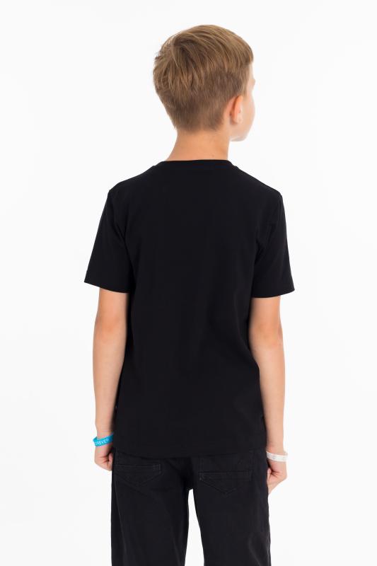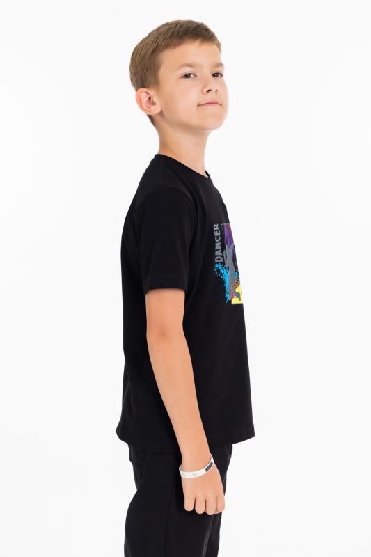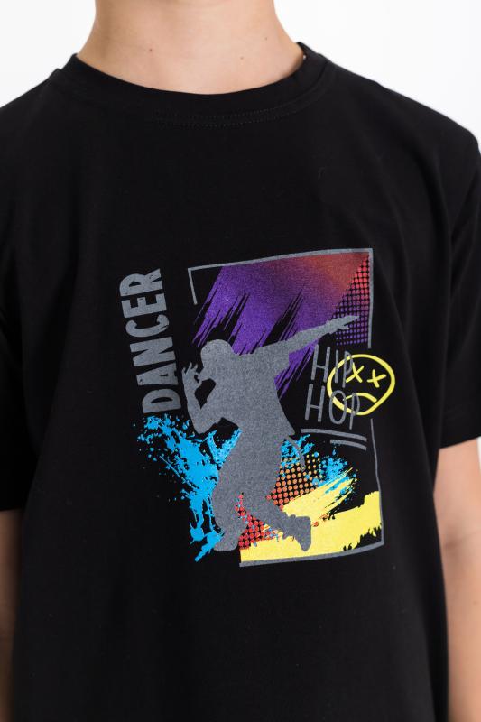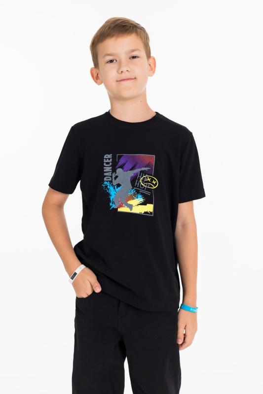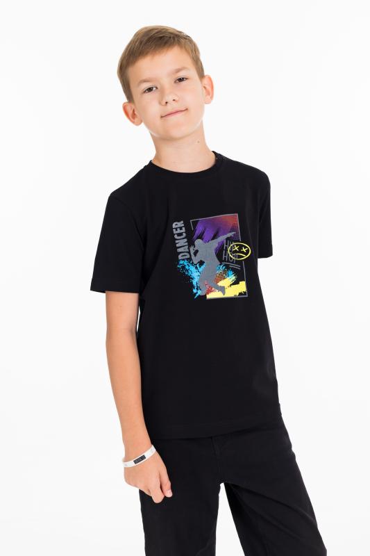 Футболка с принтом спереди выполнена из х-б полотна. Планка горловины выполнена из рибаны чёрного цвета, по плечевым швам и середине рукава настрочена репсовая лента .