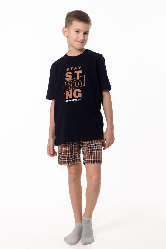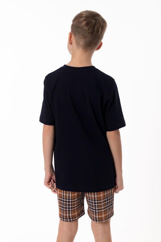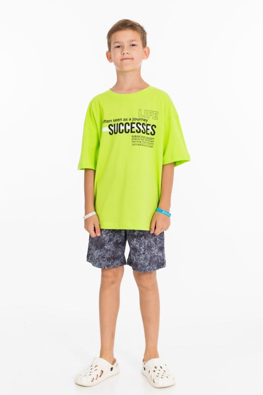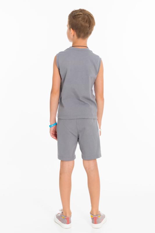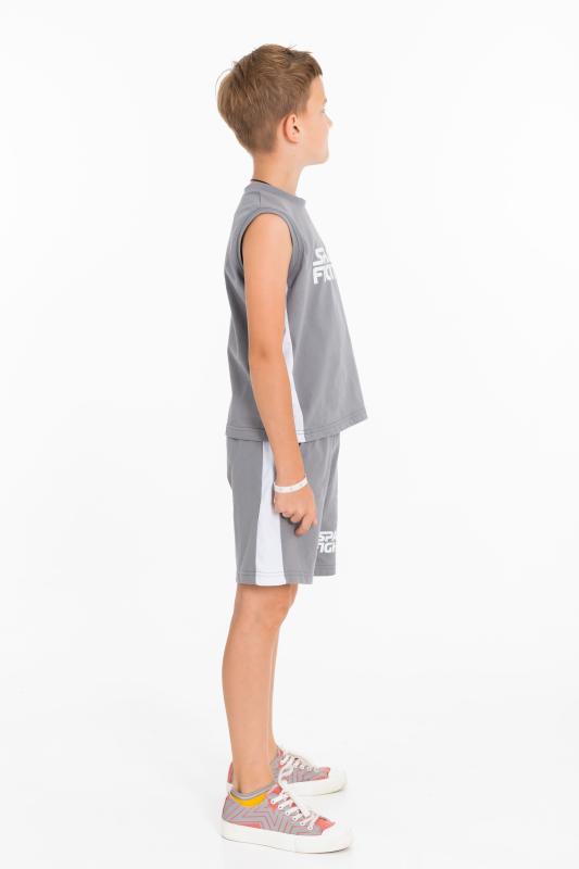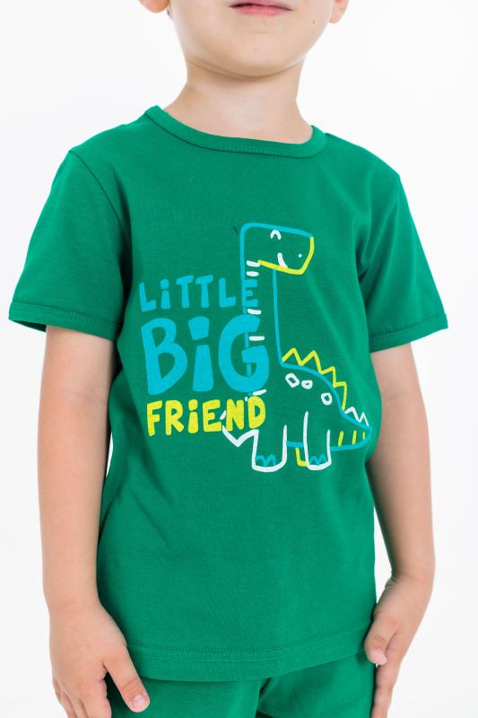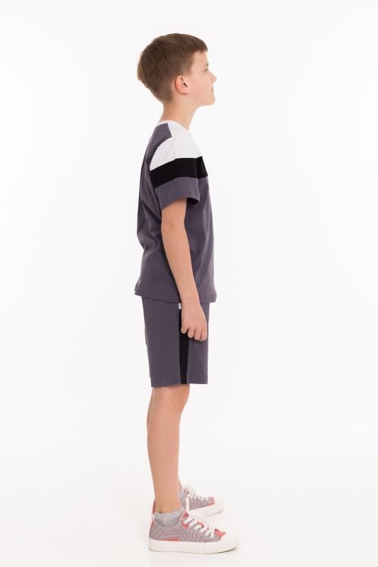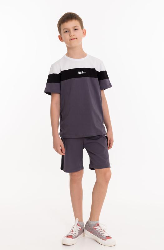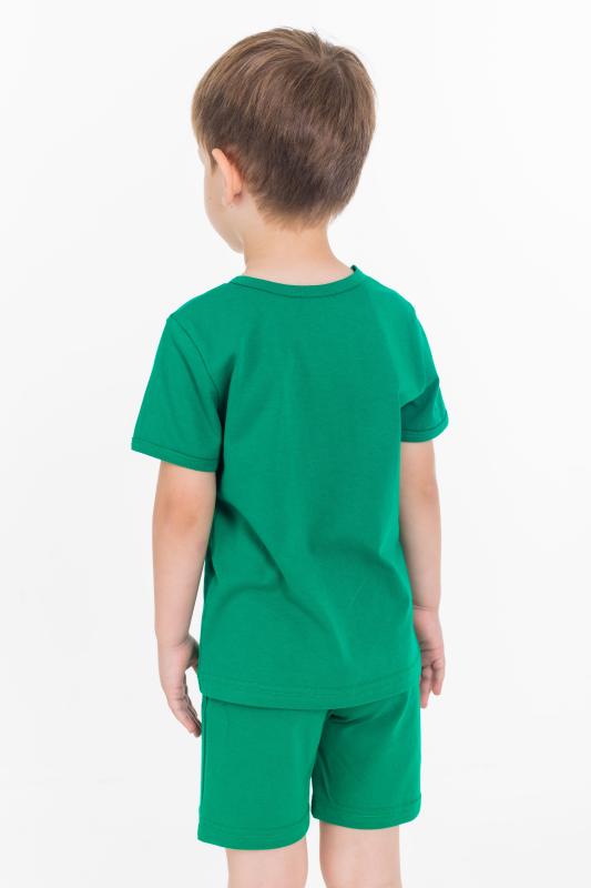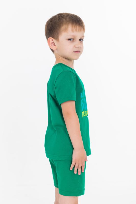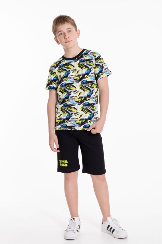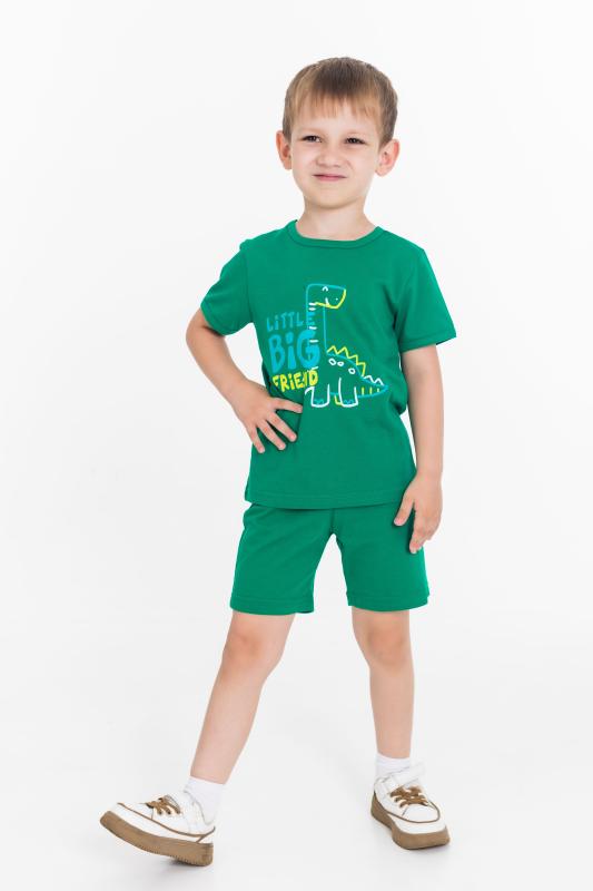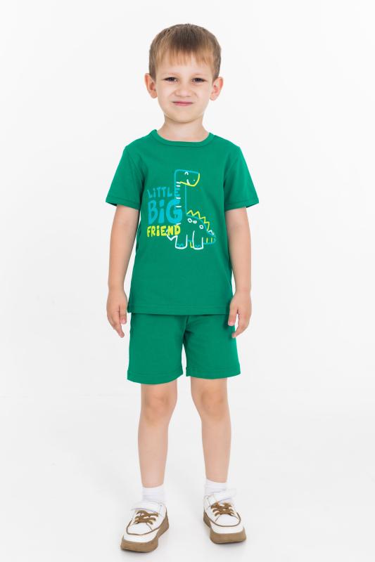 Костюм для мальчика выполнен из кулирки, состоит из футболки и шорт. Футболка с круглым вырезом горловины и принтом спереди. Шорты с поясом на резинке.
