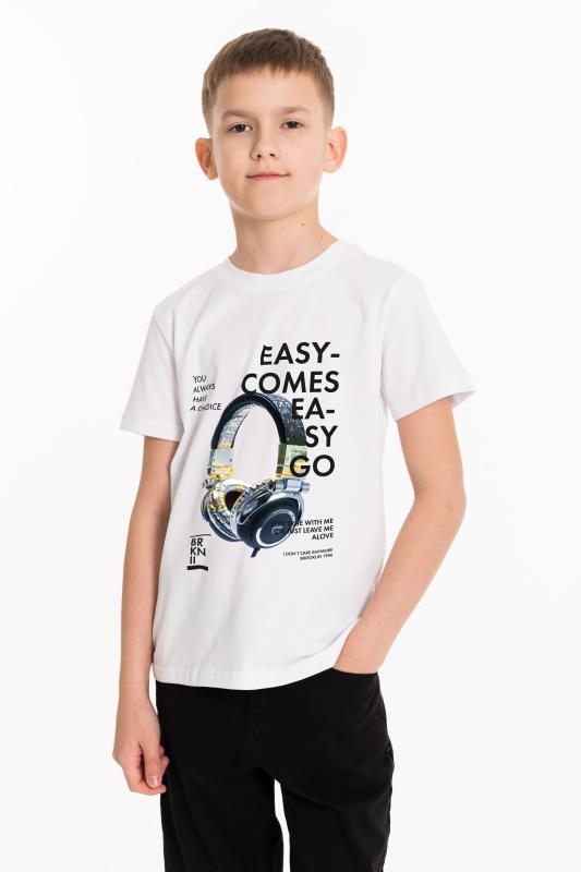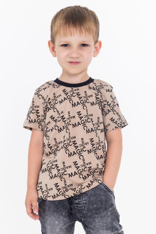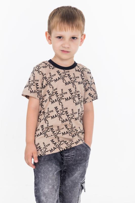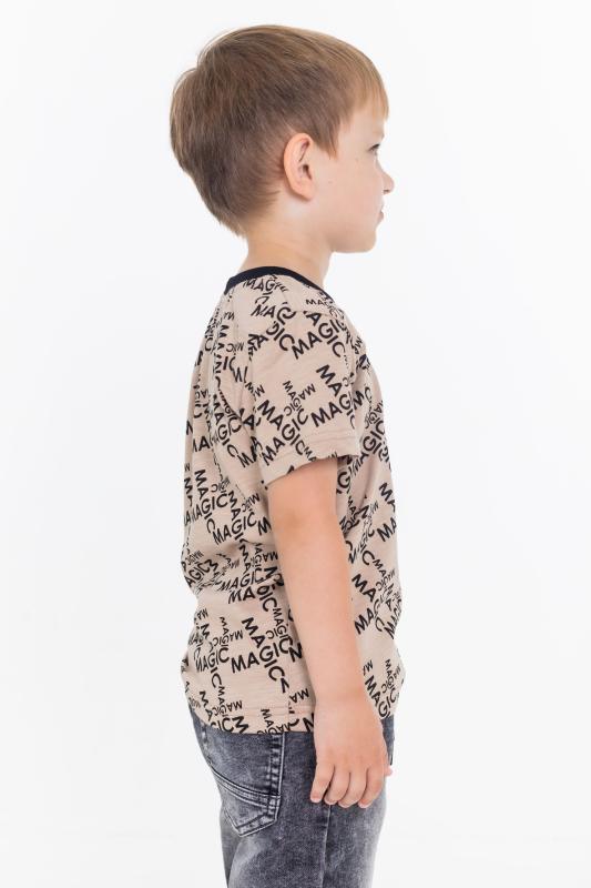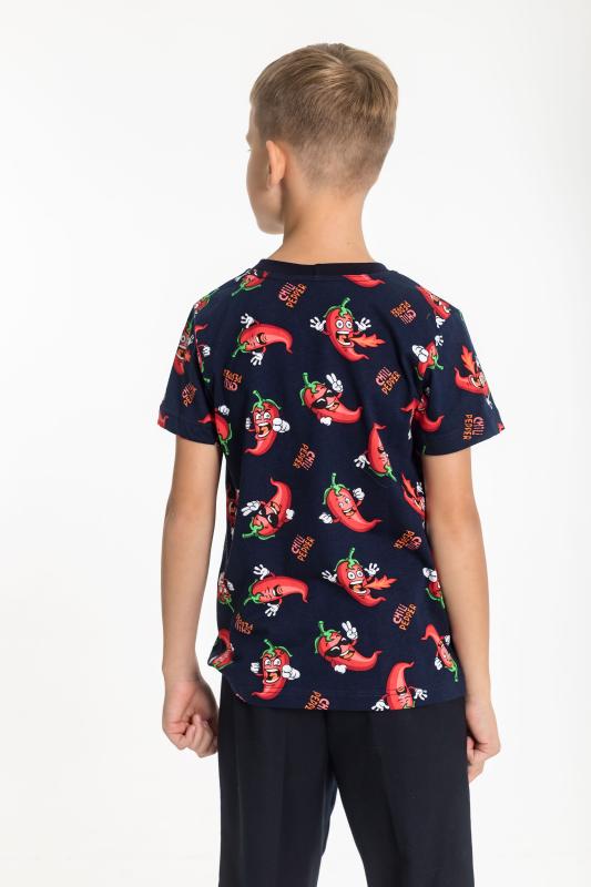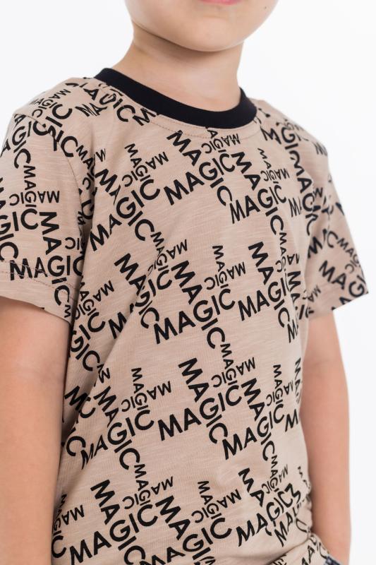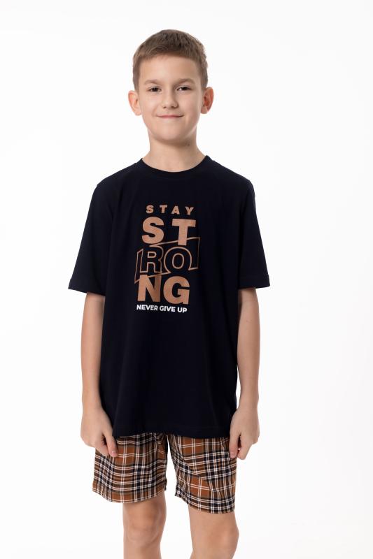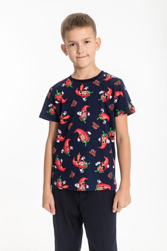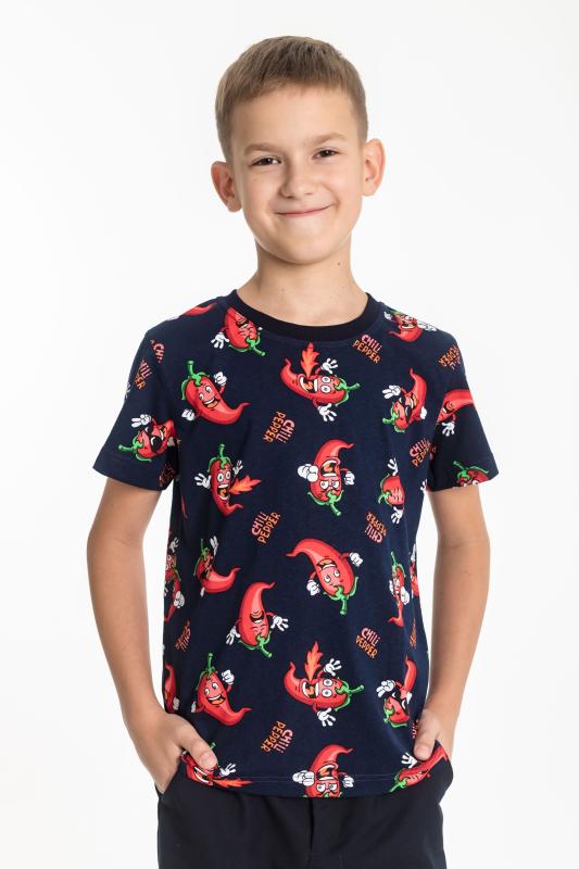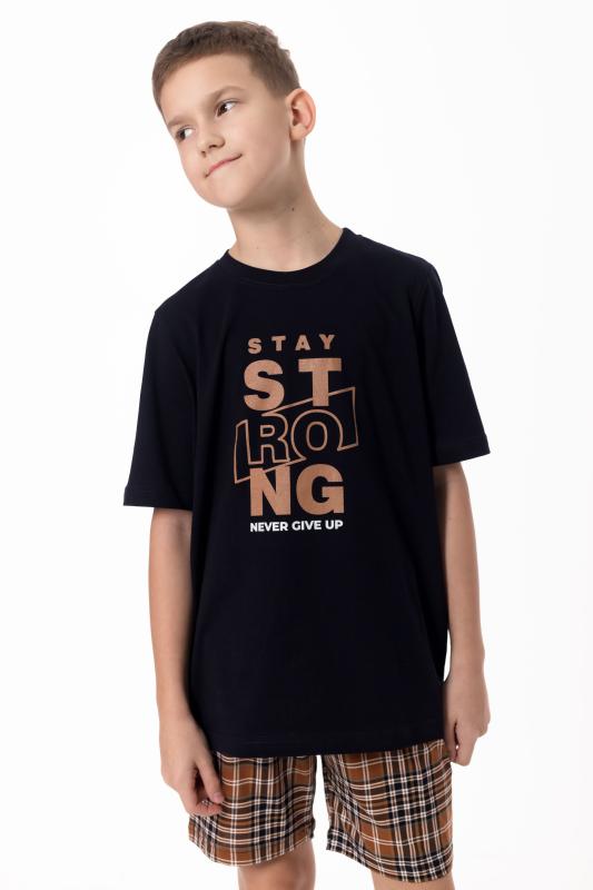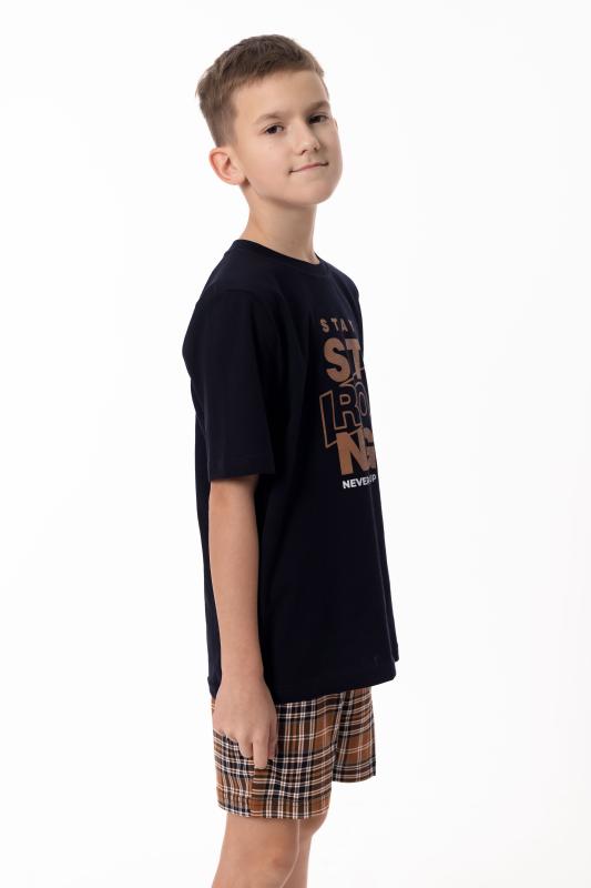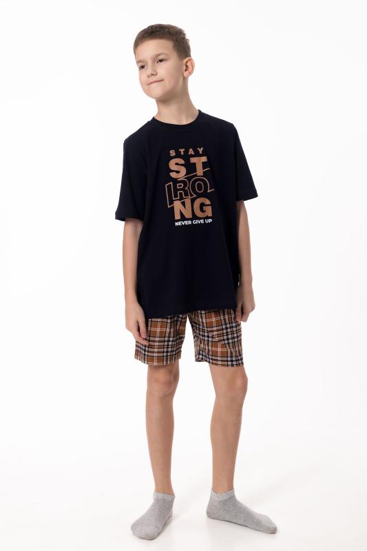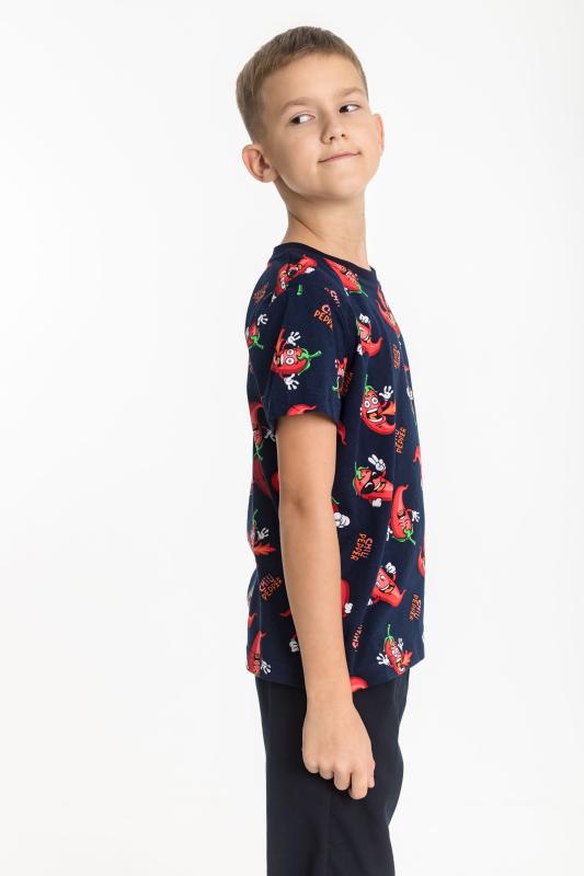 Костюм для мальчика выполнен из кулирки, состоит из футболки и шорт. Футболка с круглым вырезом горловины и принтом спереди. Шорты с поясом на резинке.