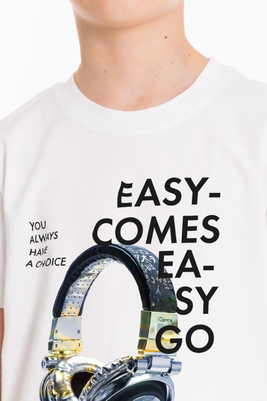 Футболка с принтом выполнена из однотонной кулирки с лайкрой. С коротким рукавом и круглым вырезом горловины.