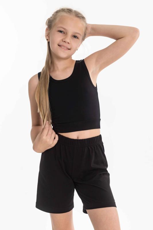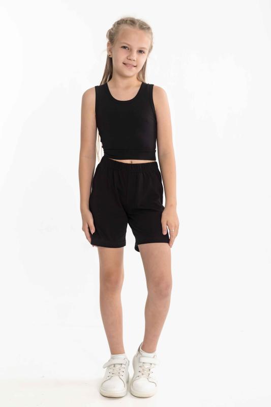 Детские шорты выполнены из футер петли с лайкрой. В поясе вставлена эластичная резина. Низ шорт оформлен отворотами. Спереди размещены два кармана.