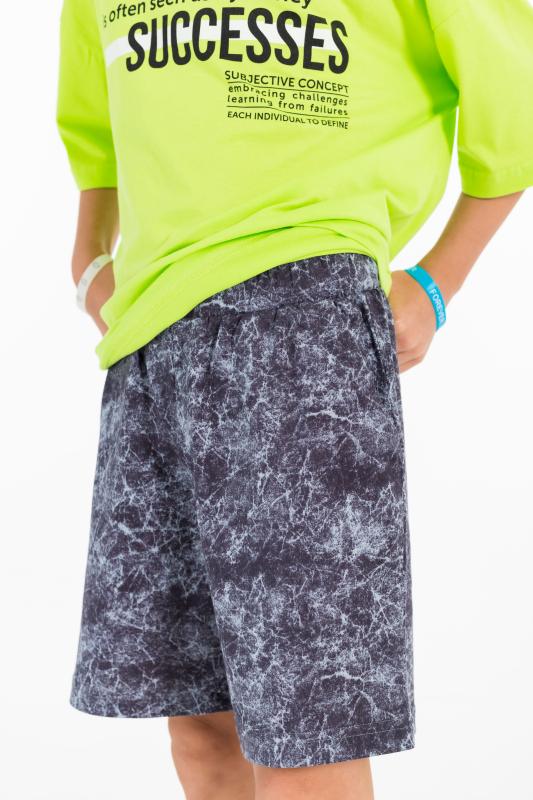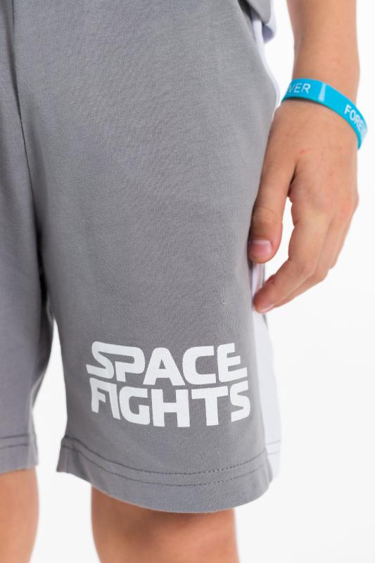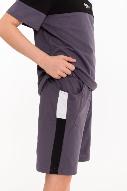 Костюм состоит из шорт и футболки. Футболка из однотонной кулирки, свободного покроя, с рукавами реглан. Шорты из однотонного футера, с притачным поясом со шнуром и боковыми карманами. На футболке и шортах нанесён принт.