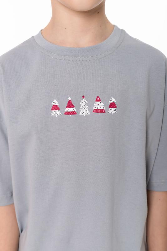 Футболка выполнена из однотонной кулирки. Свободный покрой, с коротким спущенным рукавом. Круглая горловина оформлена притачной планкой. Спереди нанесён принт.