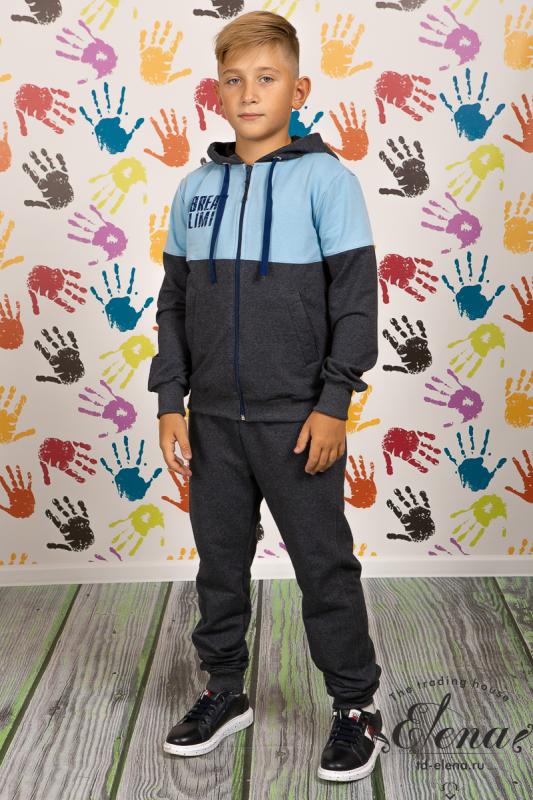 Костюм выполнен из футер петли с лайкрой. Толстовка с капюшоном и застёжкой на молнии, ширина капюшона регулируется при помощи шнура. На толстовке по бокам размещены карманы, пояс и манжеты на рукавах и брюках из кашкорсе. На толстовке и брюках нанесён принт. Размерный ряд: 30-42.