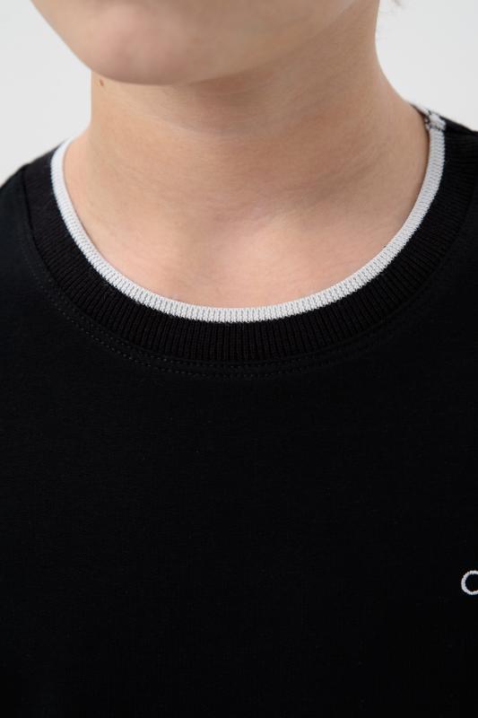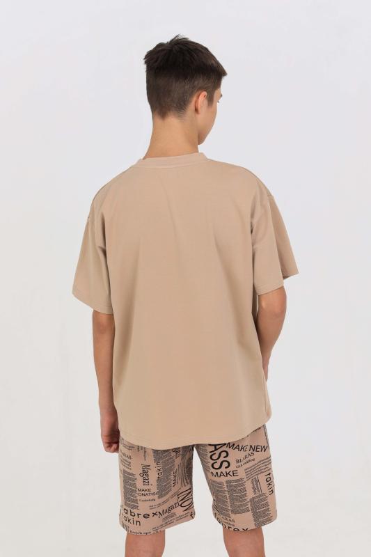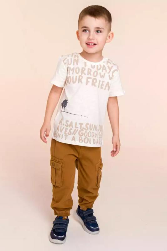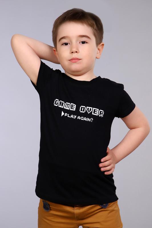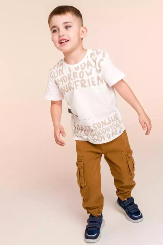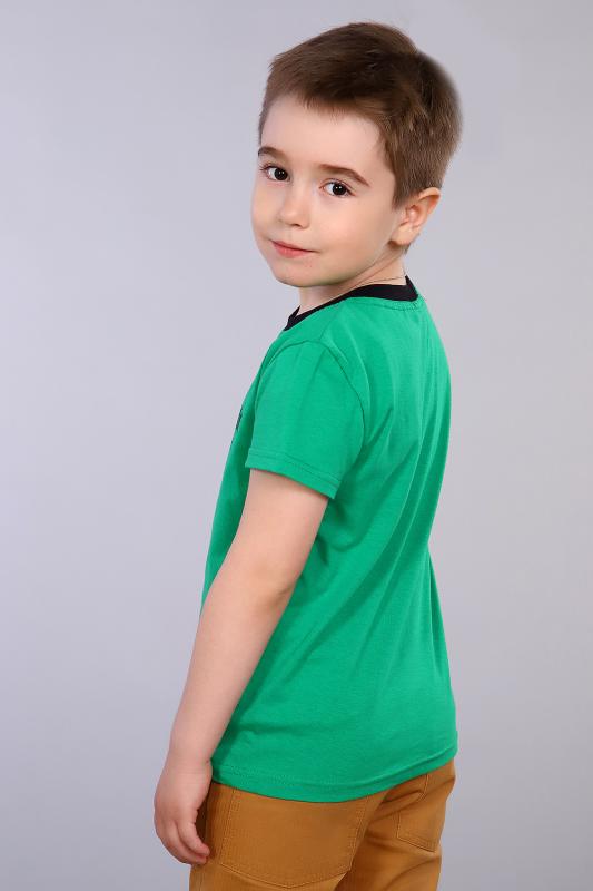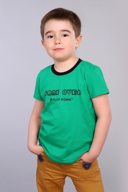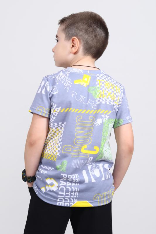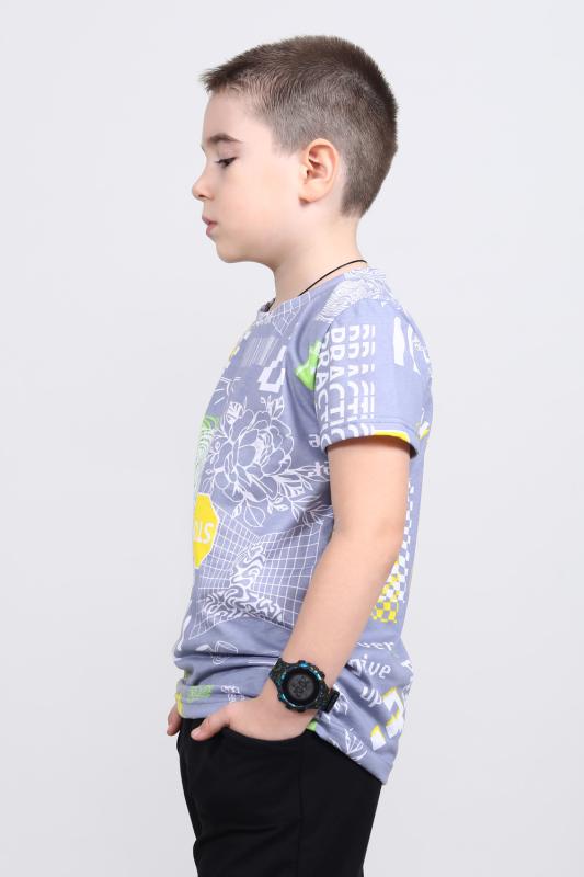 Хлопковая футболка для мальчика с короткими рукавами. Сшита из лёгкого трикотажа кулирка и украшена принтом. Рукава и низ изделия обработаны плоскими швами. На задней части горловины присутствует усиление.