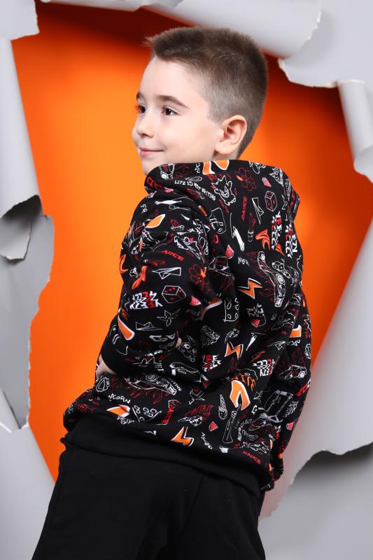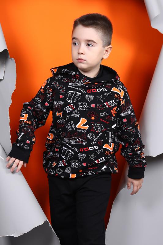 для мальчика, предназначена для носки в прохладных помещениях и прогулки на улице, выполнена из мягкого футера с начёсом. Толстовка на эластичном поясе, рукава покроя реглан на манжетах, застёжка по шву рукава - реглан на клёпки. Принт, нанесённый методом шелкографии на ткани. Для сохранения первоначальных свойств изделия, очень важно соблюдать рекомендации по уходу за изделием, указанные на этикетке.