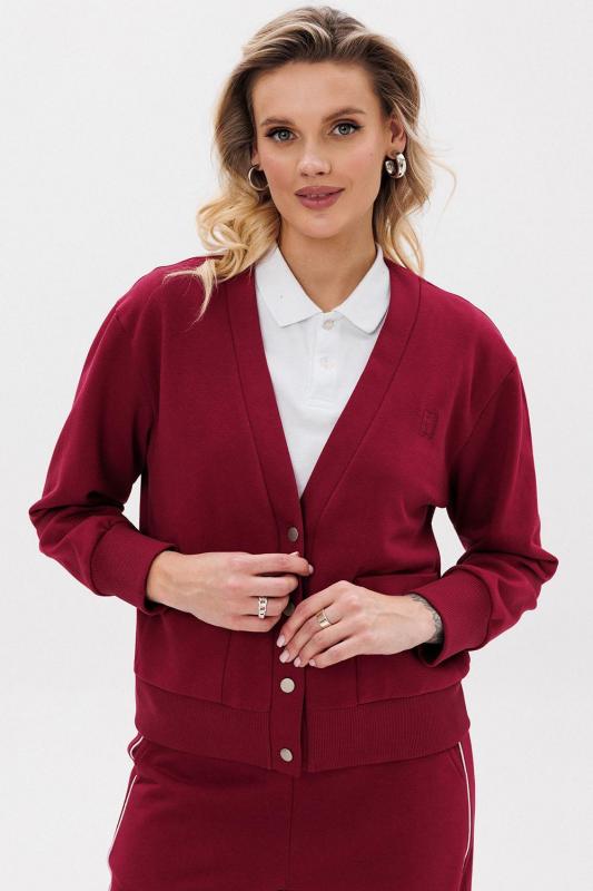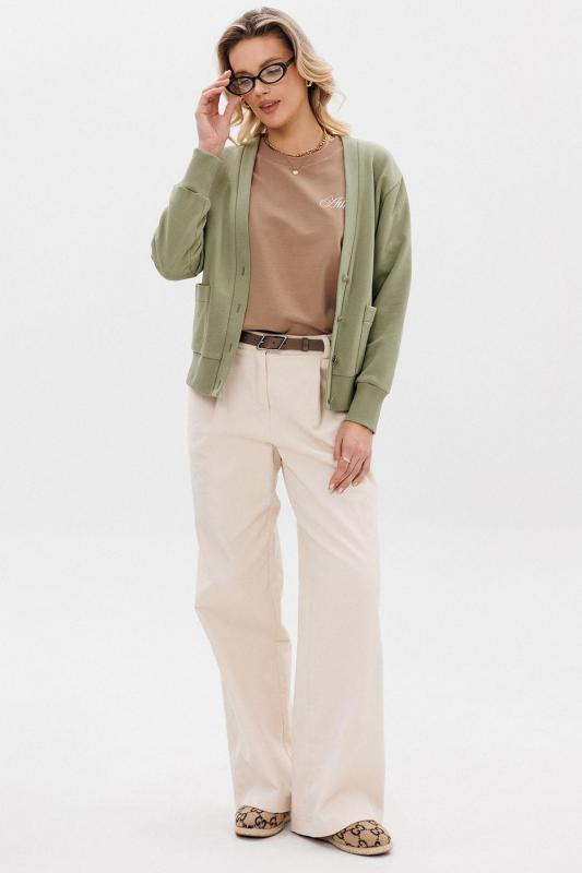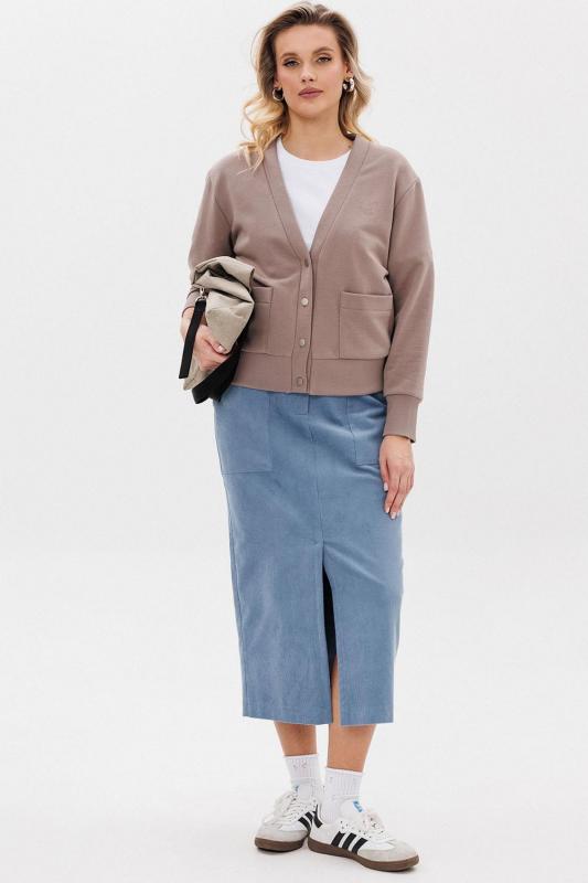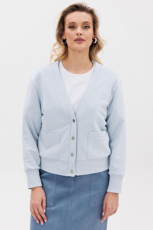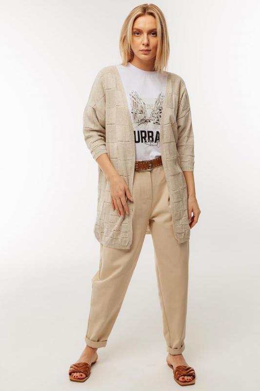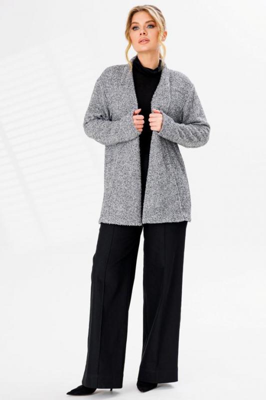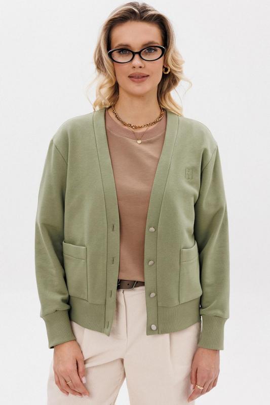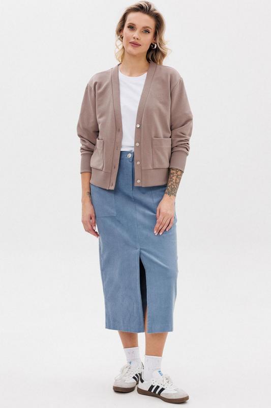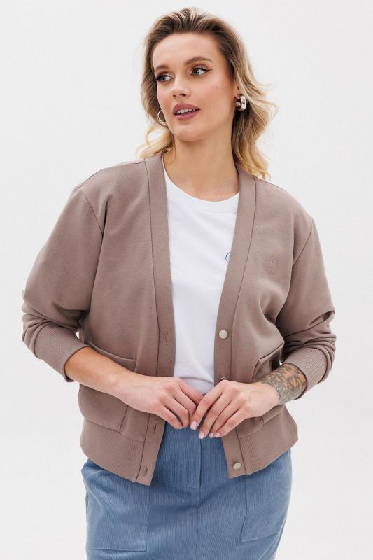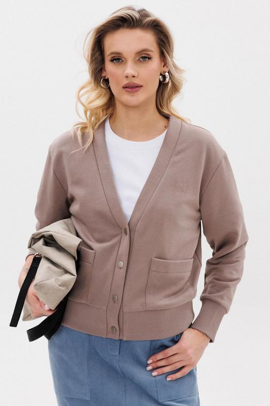 Кардиган женский прямого силуэта из трикотажной ткани (двунитка-футер). На полочке и спинке расположены декоративные, необработанные швы. В верхней и нижней части переда есть настрочные элементы с печатью и тесьмой. По переду изделия карманы. Спинка со средним швом и кокеткой. На кокетке расположен элемент с печатью и тесьмой. Рукав спущенный с манжетой. Вырез горловины оформлен стойкой. По переду изделия планка с кнопками. Промеры на примере 52 размера: Ог - 122 см (спущенное плечо), Об - 122 см. Длина изделия: 98 см ±1.0 Длина рукава от основания шеи: 59 см ±1.0