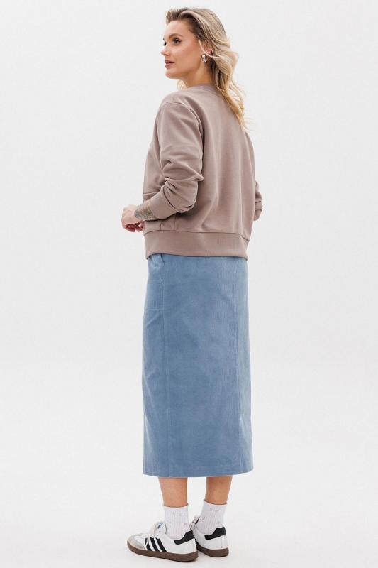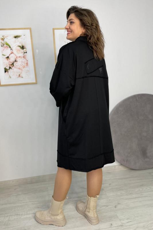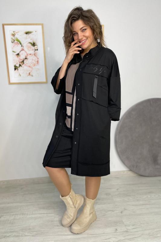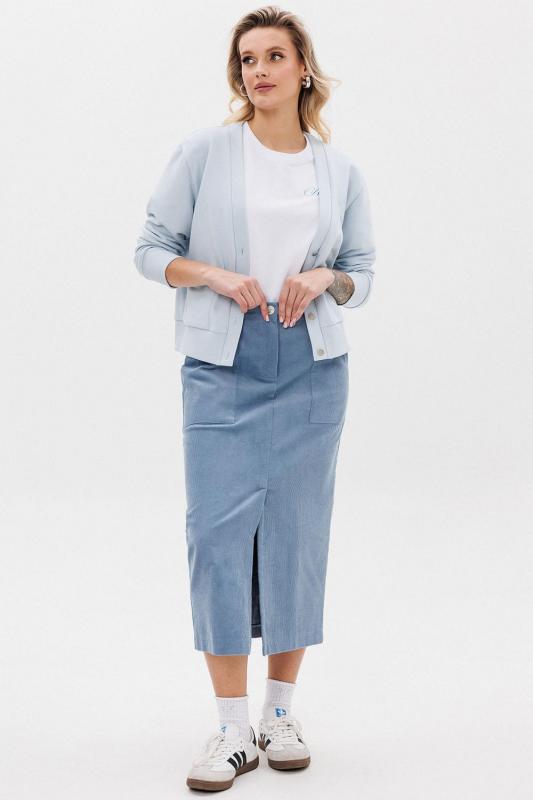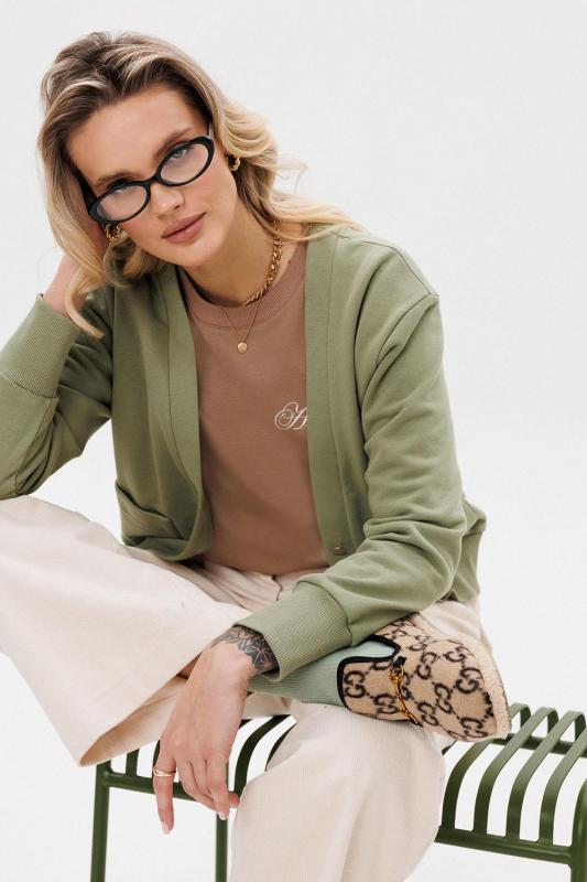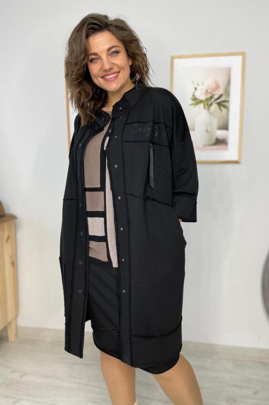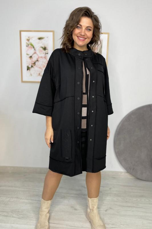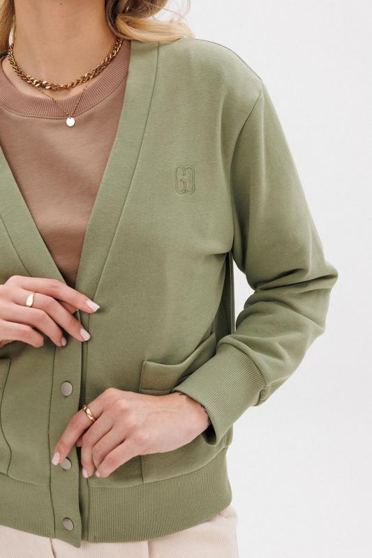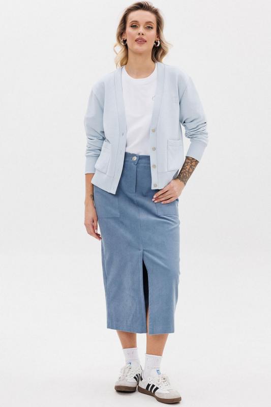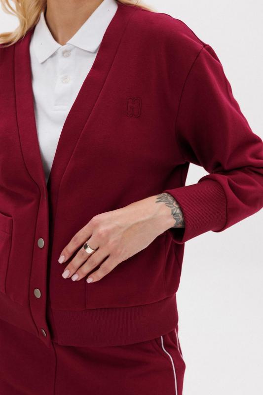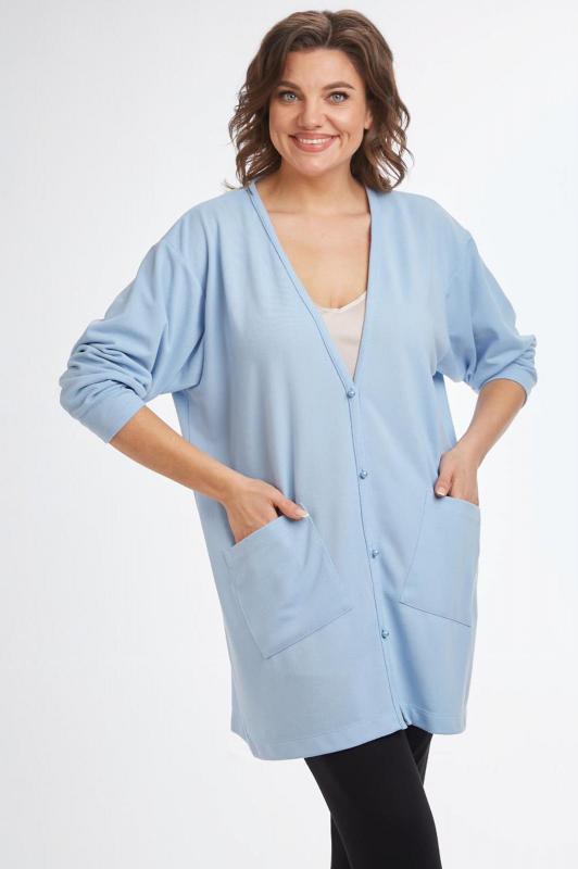Кардиган женский прямого силуэта из трикотажной ткани (двунитка-футер). На полочке и спинке расположены декоративные, необработанные швы. В верхней и нижней части переда есть настрочные элементы с печатью и тесьмой. По переду изделия карманы. Спинка со средним швом и кокеткой. На кокетке расположен элемент с печатью и тесьмой. Рукав спущенный с манжетой. Вырез горловины оформлен стойкой. По переду изделия планка с кнопками. Промеры на примере 52 размера: Ог - 122 см (спущенное плечо), Об - 122 см. Длина изделия: 98 см ±1.0 Длина рукава от основания шеи: 59 см ±1.0
