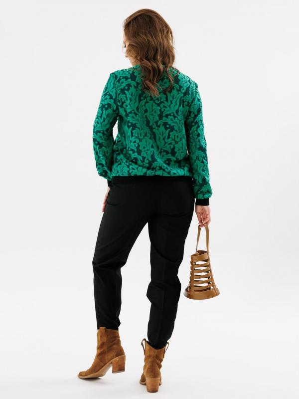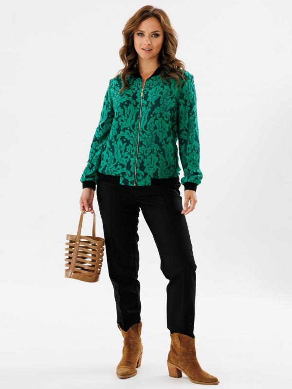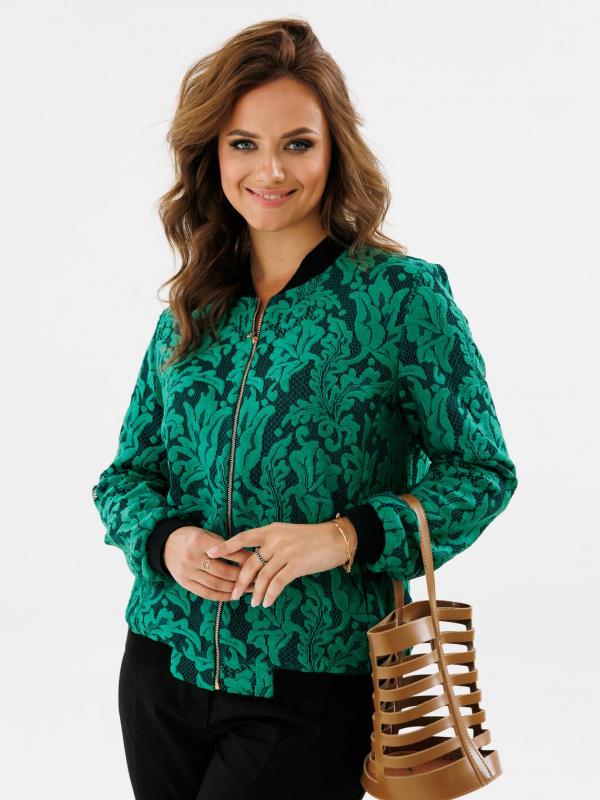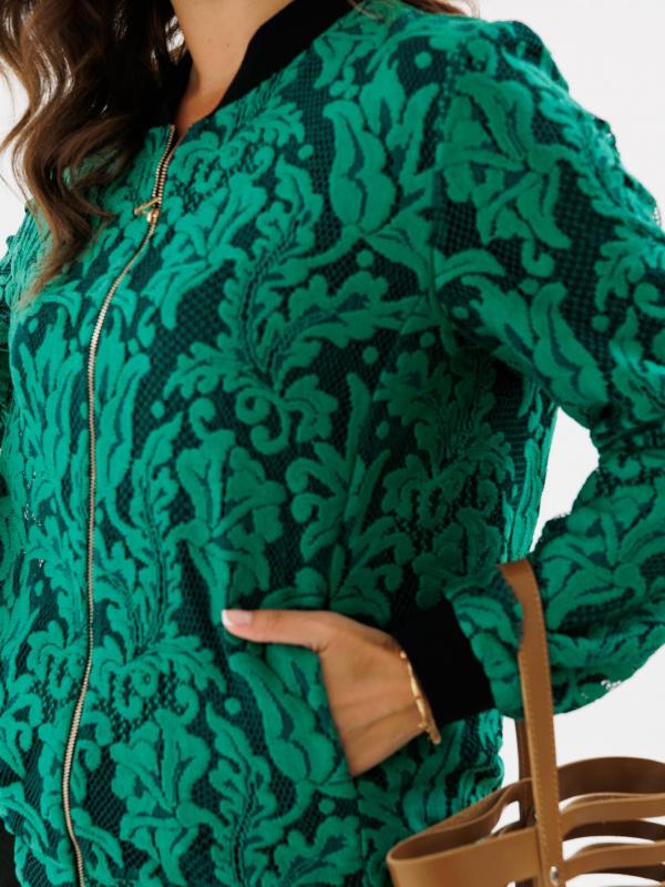 Нарядный трикотажный бомбер прямого силуэта. Жакет из трикотажного полотна в виде кружева будет комфортной и незаменимой вещью в гардеробе. Летняя куртка как ветровка пригодиться в прохладный вечер. По переду в рельефных швах карманы. Рукав втачной длинный с манжетой по низу. Бомбер застегивается на молнию по низу изделия притачной трикотажный пояс. Кофта на подкладке нараспашку удобна в тройке с шелковым топом.