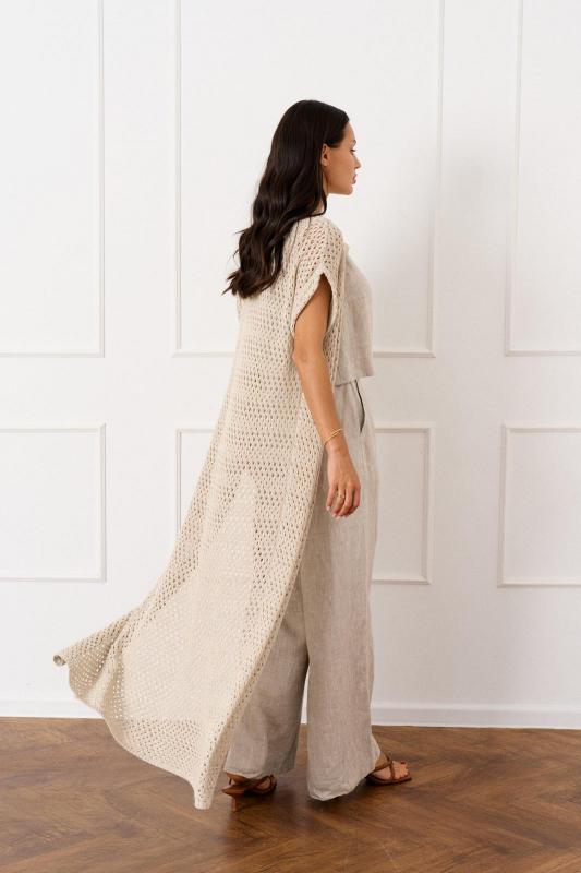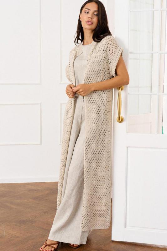 Этот элегантный вязаный кардиган станет отличным дополнением вашего гардероба. Выполненный из мягкой бежевой пряжи с ажурным узором, он имеет короткие рукава и V-образный вырез. Кардиган без застежки, данный элемент добавляет ему уникальный шарм и изысканность. Особенности: Материал: 100% натуральная пряжа Фасон: короткие рукава, V-образный вырез, ажурный узор Длина: в пол Подходит для любого сезона Этот кардиган идеально подходит для создания стильных и комфортных образов как на каждый день, так и для особых случаев.