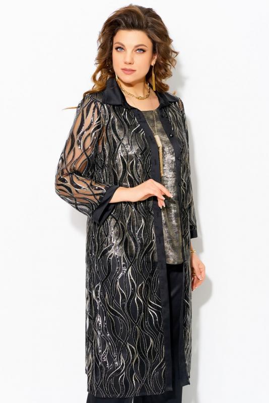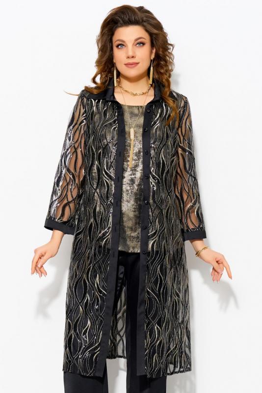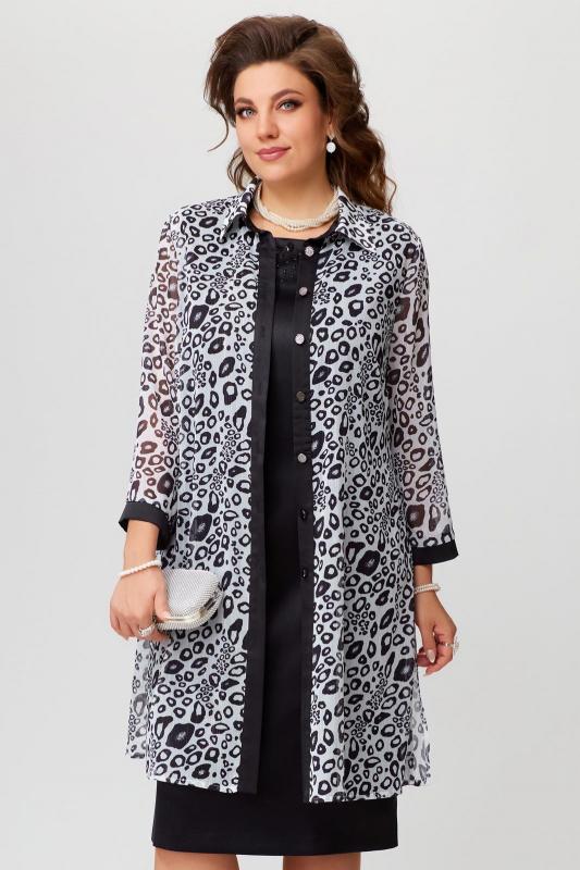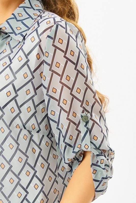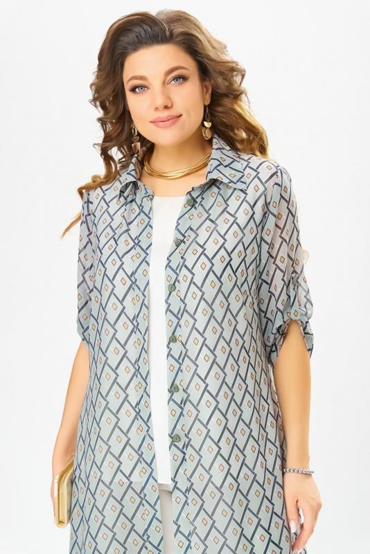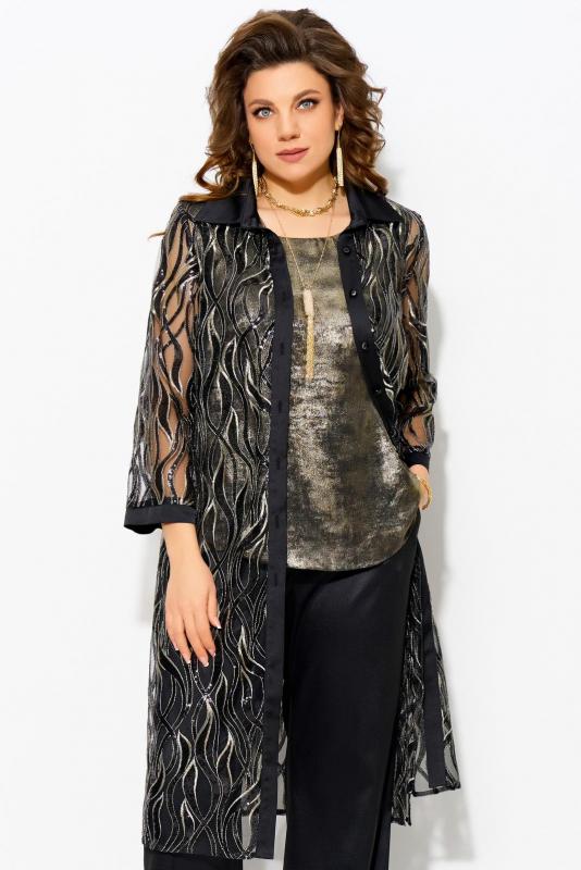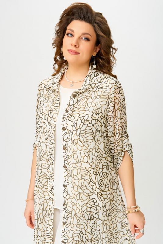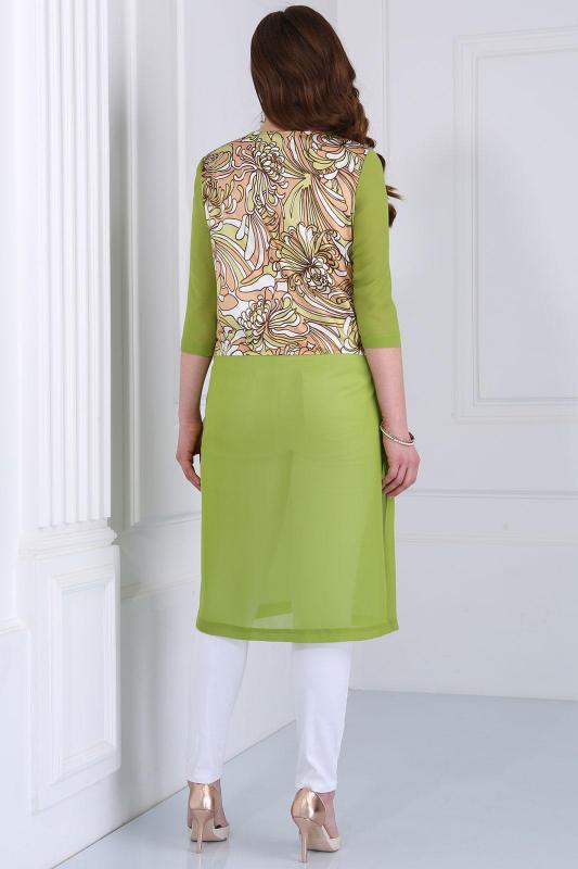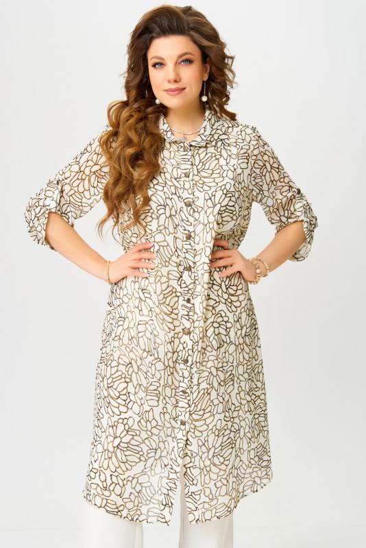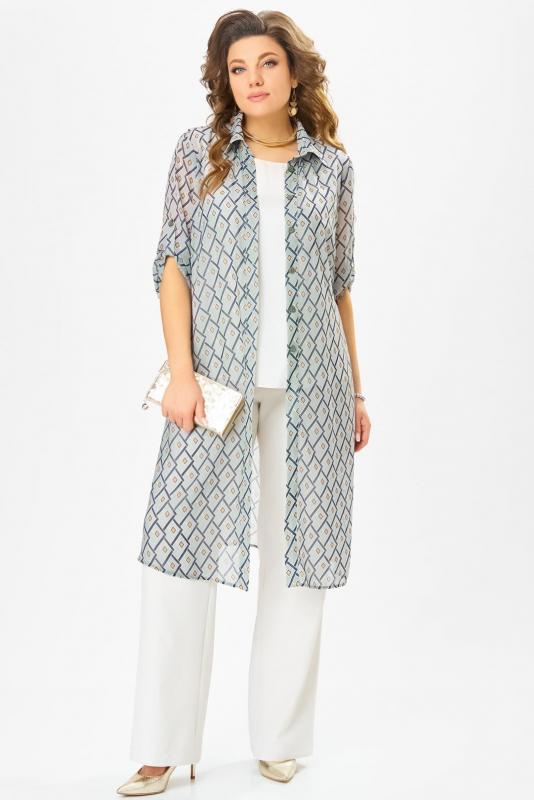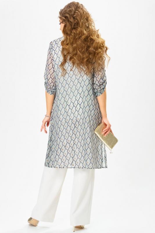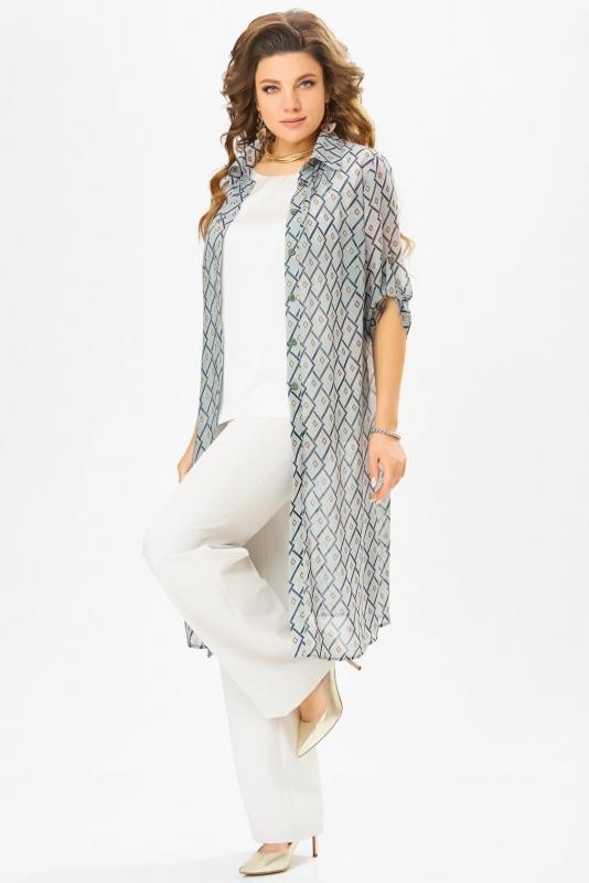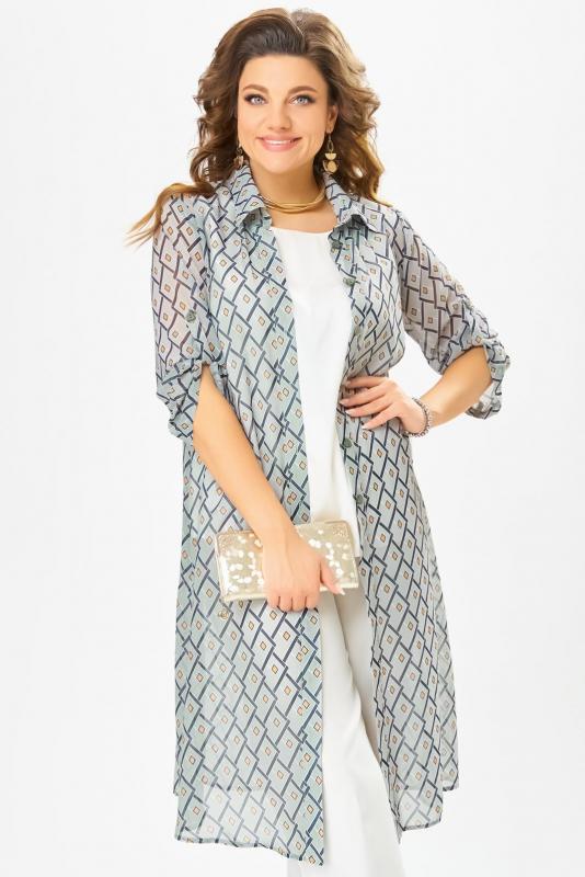Кардиган женский прямого силуэта. Отрезной верх с заниженной линией талии выполнен из ткани с рисунком, низ рукава и планки из шифона. Застежка центральная на петли-пуговицы. На полочках нагрудные вытачки с бокового шва. Горловина круглая с отрезными планками. Рукав втачной, одношовный 3-4. Боковые швы на шифоне с высокими разрезами. Длина 52-56 размерах 110 см, длина рукава 45 см, длина в 58-62 размерах 113 см, длина рукава 46 см.
