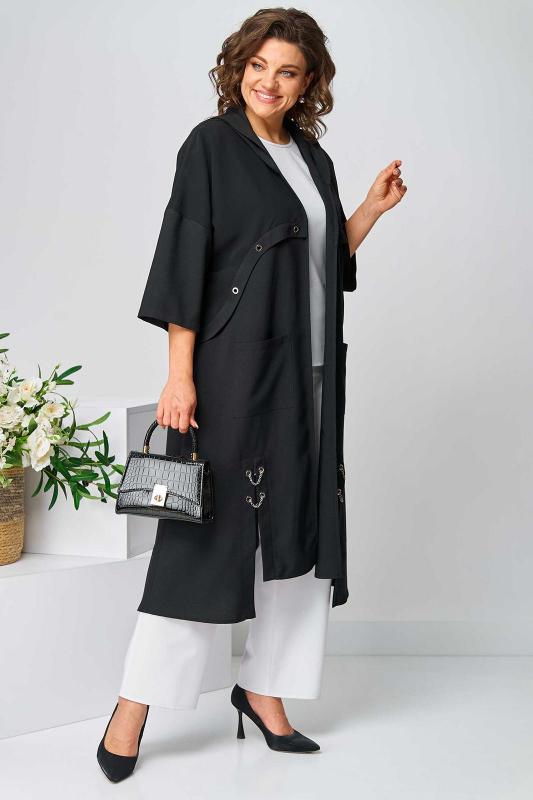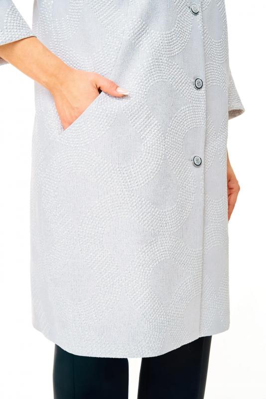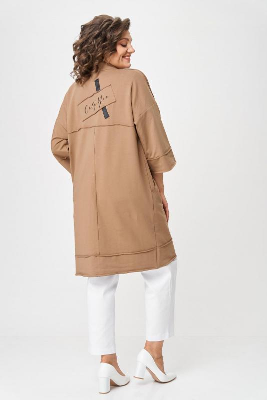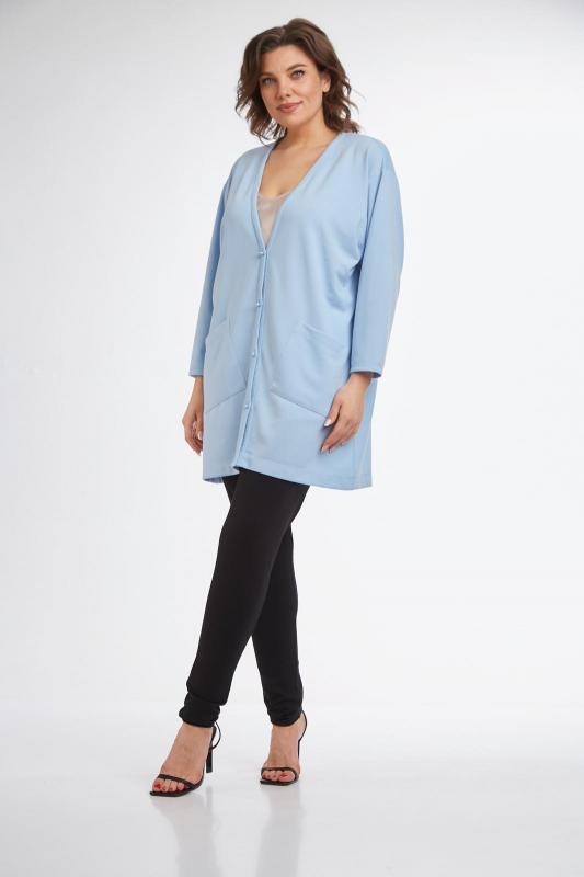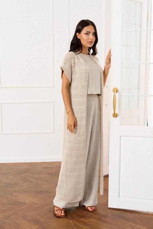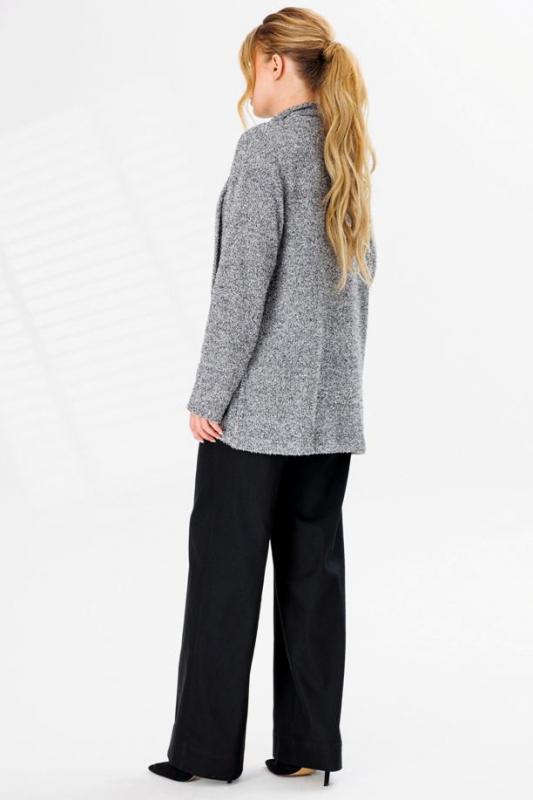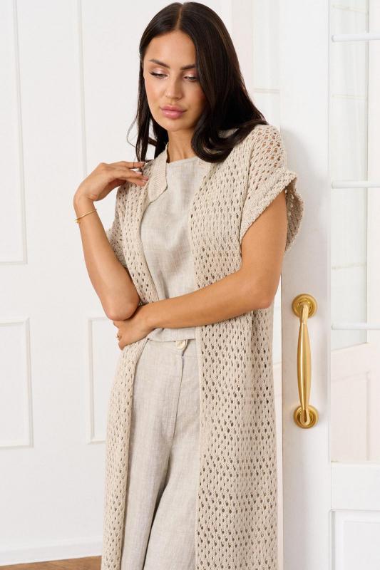 Женский удлиненный жакет-кардиган, на подкладке, прямого силуэта. Горловина округлой формы, от горловины идут рельефы, закругленные к боковому шву, в которых обработаны карманы. Спинка цельная. Рукав втачной, двухшовный, 3-4. Длина рукава 49 см, длина по спинке 89 см.