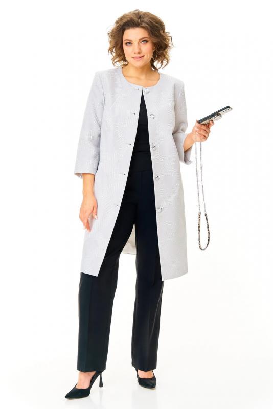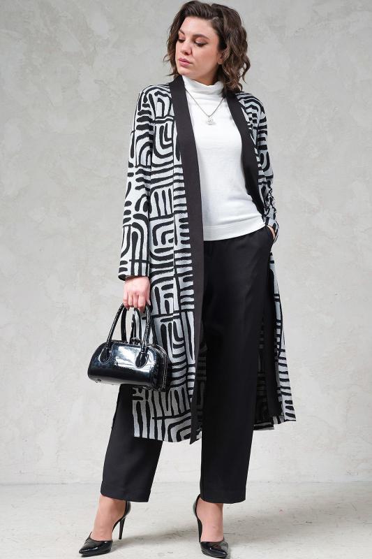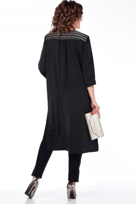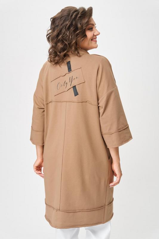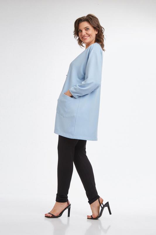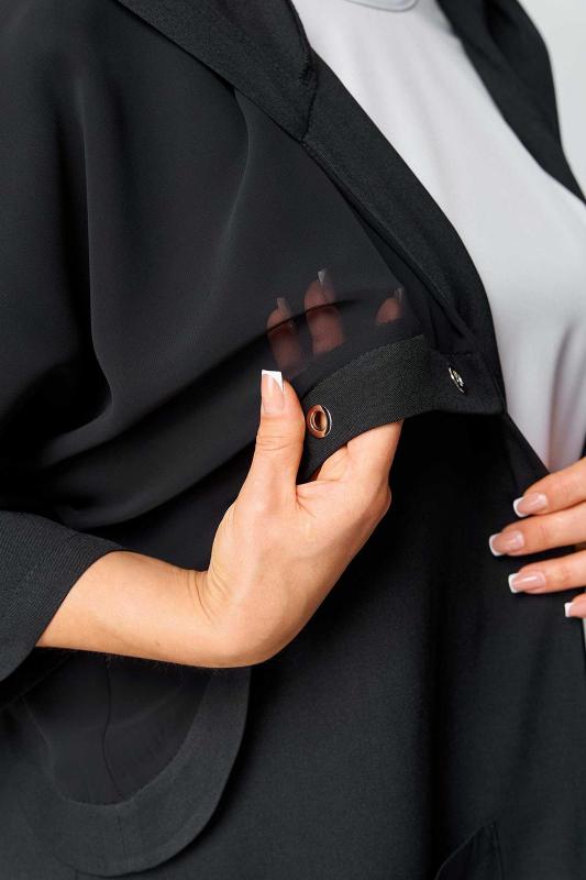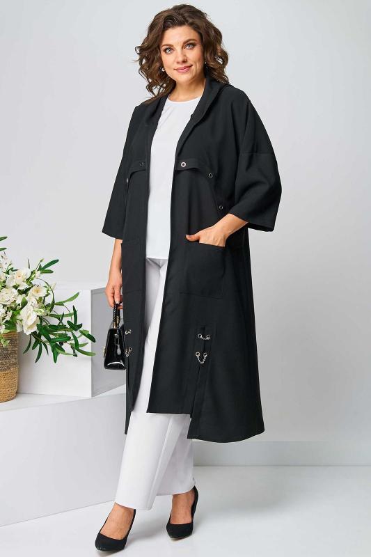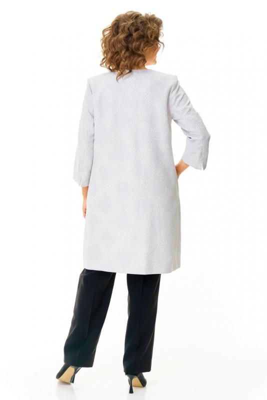 Женский удлиненный жакет-кардиган, на подкладке, прямого силуэта. Горловина округлой формы, от горловины идут рельефы, закругленные к боковому шву, в которых обработаны карманы. Спинка цельная. Рукав втачной, двухшовный, 3-4. Длина рукава 49 см, длина по спинке 89 см.