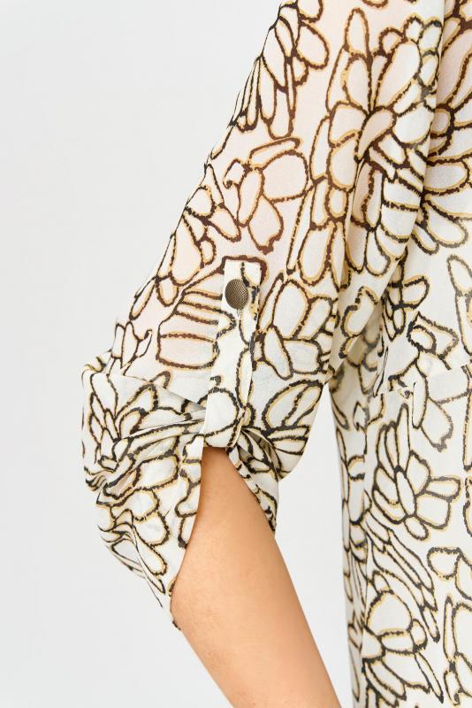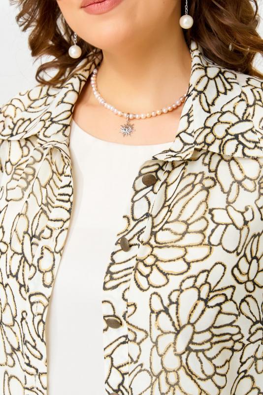 Кардиган нарядный из креп-шифона Димия прямого силуэта, с застежкой на петли и пуговицы. Кардиган выполнен и высококачественной ткани с цветочным принтом. Край борта обработан планкой. Воротник отложной со стойкой рубашечного типа. Рукав одношовный, втачной. Низ рукава обработан планкой. По боковым швам разрезы. Низ изделия обработан швом в подгибку закрытым срезом.