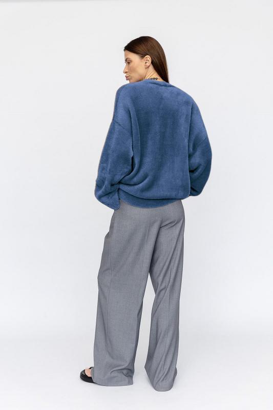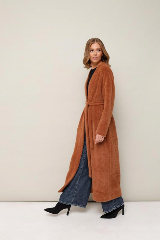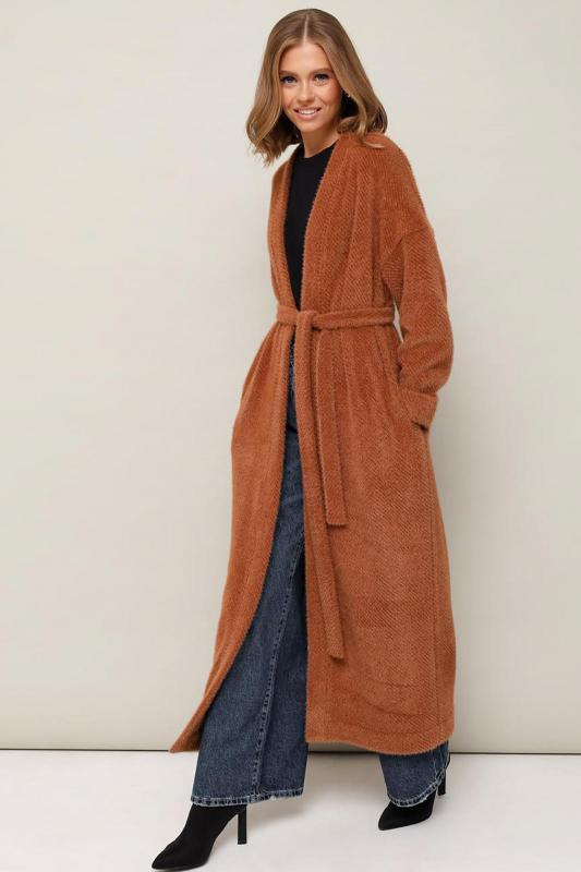 Женский кардиган прямого кроя, выполнен из мягкого пушистого трикотажного полотна. Горловина спинки и борта обработаны притачной планкой. Длинные рукава со спущенной линией втачивания плеча, по низу обработана манжета. В боковых швах внутренние карманы. В комплекте прилагается пояс из основной ткани.