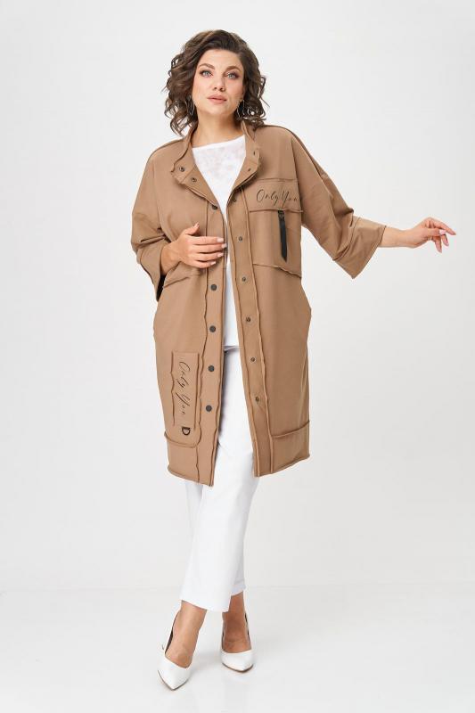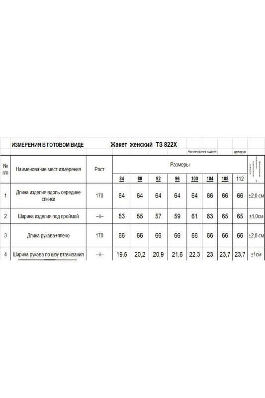 Жакет женский свободного силуэта, на подкладке, длиной ниже линии бедер, со спущенной линией плеча, с втачными рукавами, с втачной стойкой, с центральной застёжкой на 5 кнопок и 1 кнопку на стойке, понизу отстрочен «тоннель» для протяжки резинки с фиксатором. Детали переда с притачными планками, с накладными карманами, с клапанами. Рукава втачные двухшовные, с передним и локтевым швами. Декор может отличаться от представленного на фотографии. Длина изделия Длина спинки – 67,5см. Длина рукава Длина рукава и плеча - 73см, ширина рукава – 22,5см.