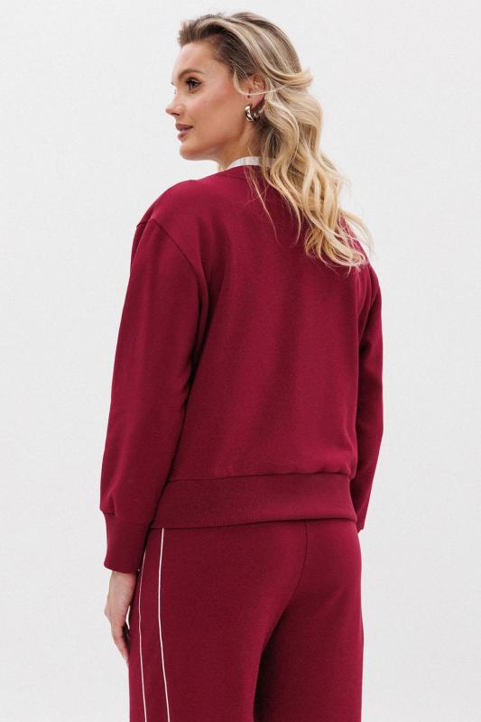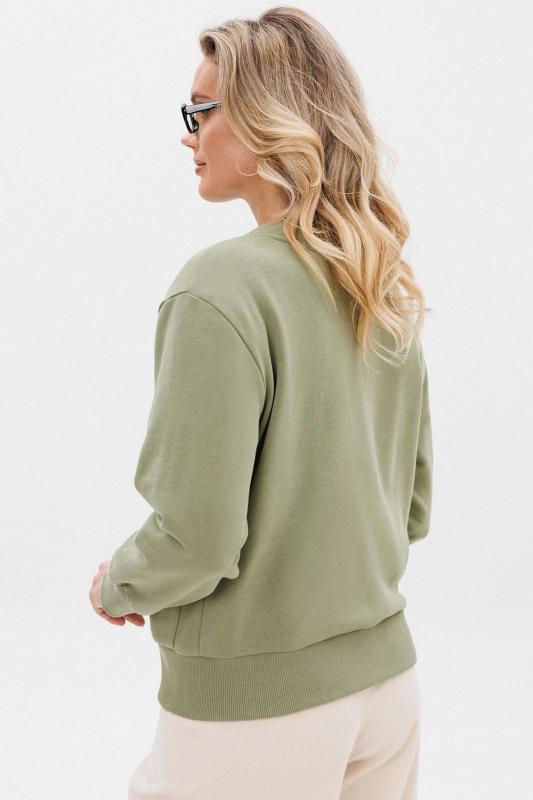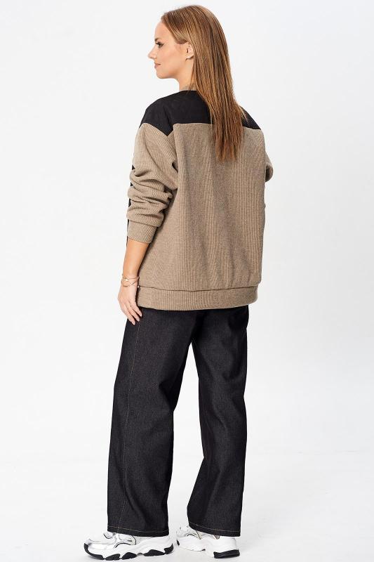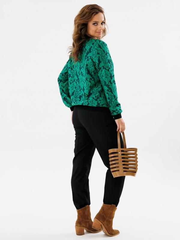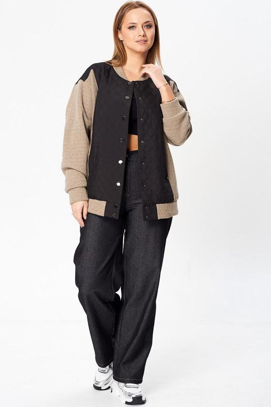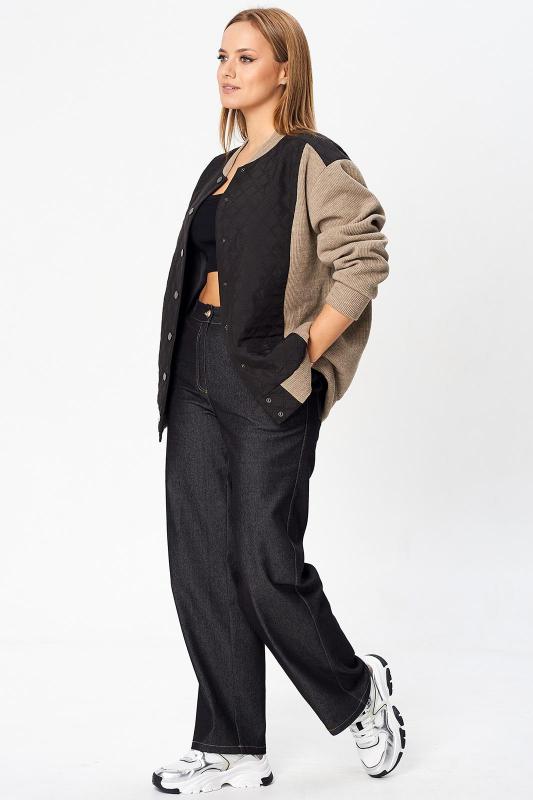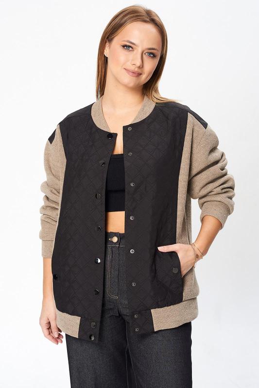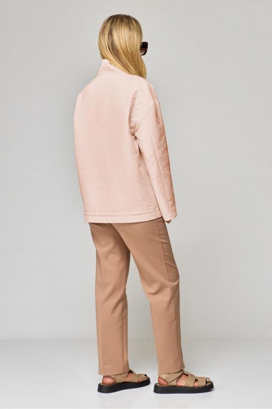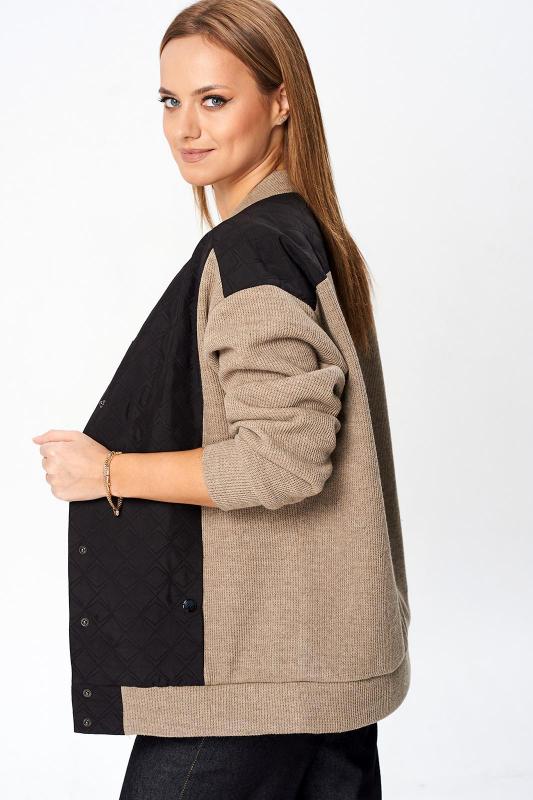 Джемпер выполнен из двух видов ткани: трикотажного полотна и стёганной ткани. Жакет со спущенной линией плеча, на подкладке. Центральная застежка на кнопки. По переду полочки в рельефных швах располагаются карманы с фиксацией на кнопку. Спинка с отрезной кокеткой. По низу джемпер собран на притачной пояс из трикотажного полотна. Низ рукавов собирается на притачную манжету. Джемпер на подкладке. Длина по спинке: 68 см. Длина рукава с учетом плеча: 76 см.
