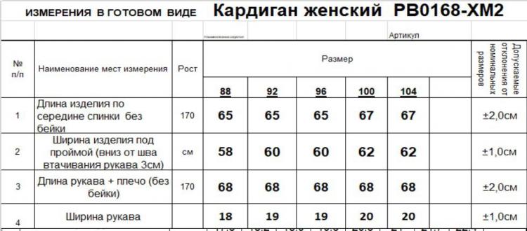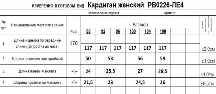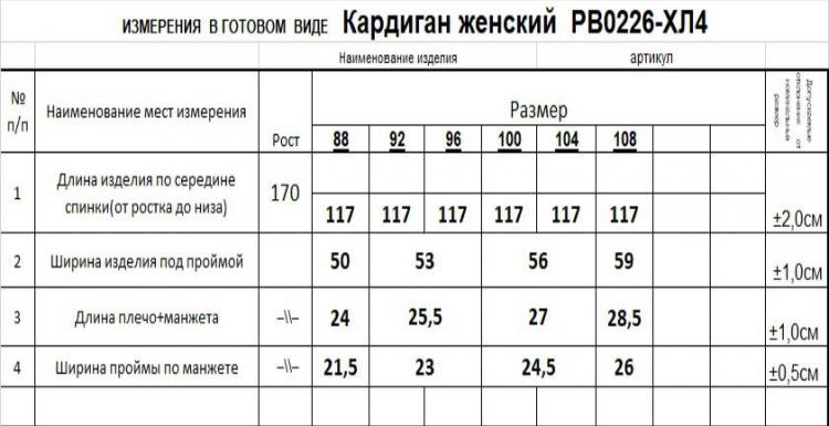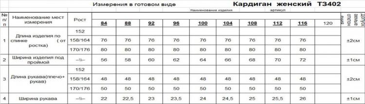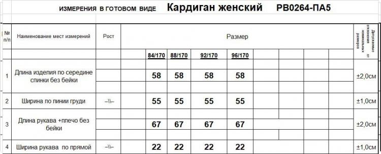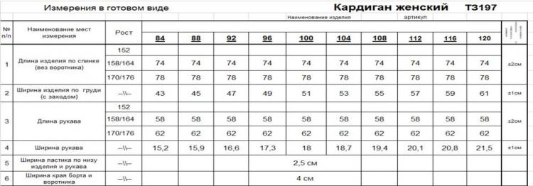 Кардиган женский прямого силуэта, с отложенным воротником, задрапированым в складку и переходящим в край борта. На линии талии борта полочек могут фиксироваться на завязки. Нагрудные вытачки из боковых швов. Рукав втачной, одношовный 3-4. Спинка со средним швом. Длина по спинке 70 см. Ширина рукава на уровне глубины проймы в 52р.-36 см, 54р.-38 см, 56р.-40 см.