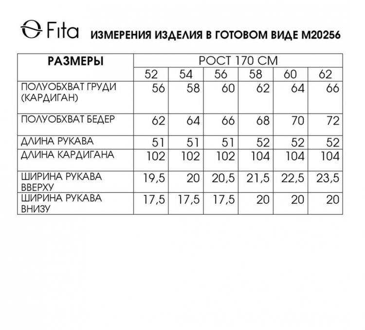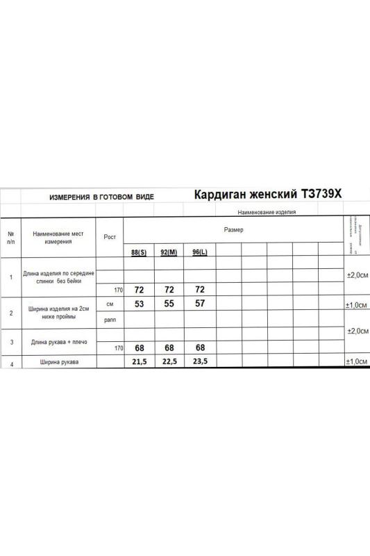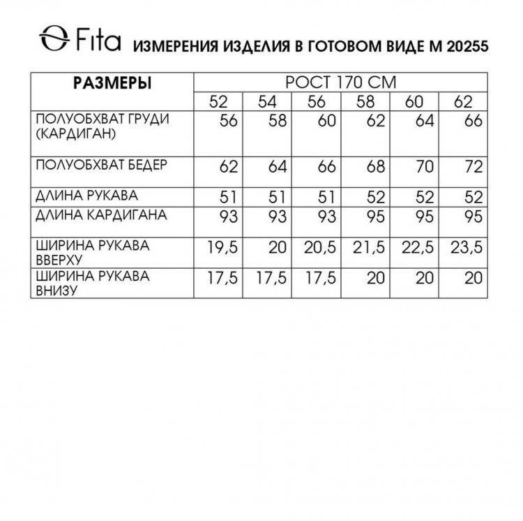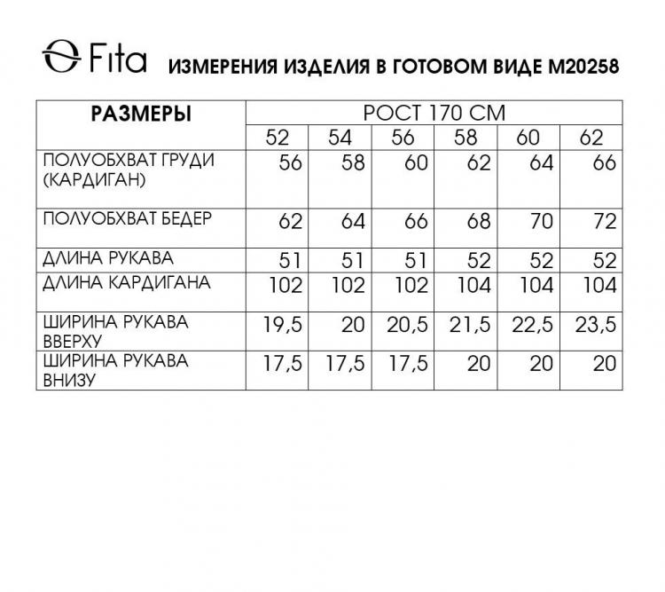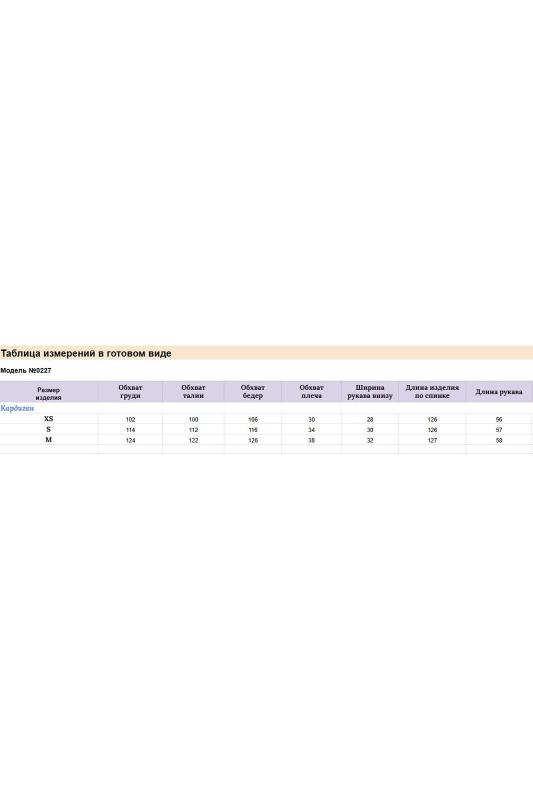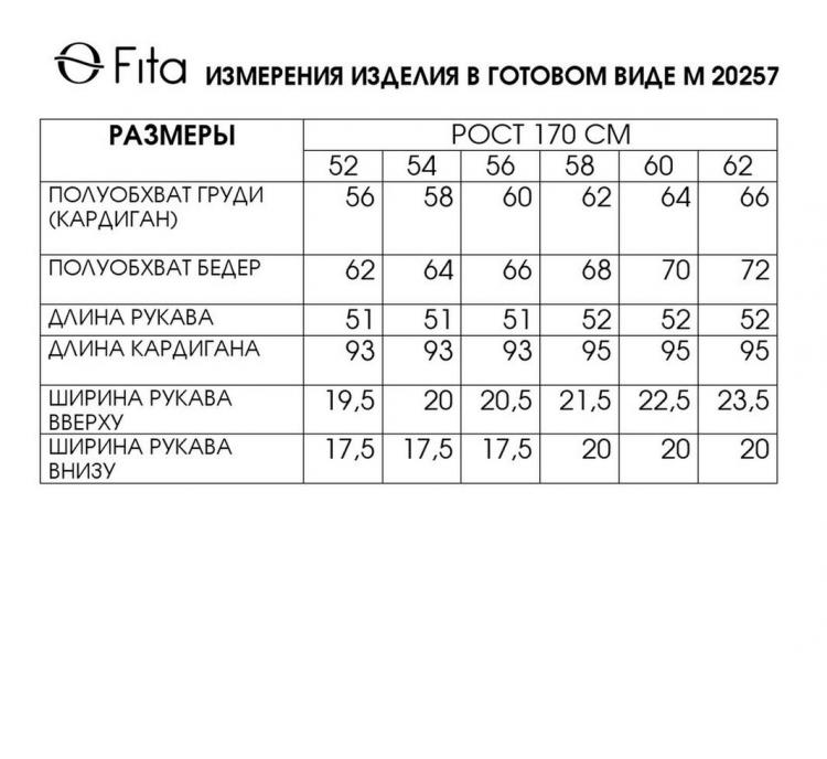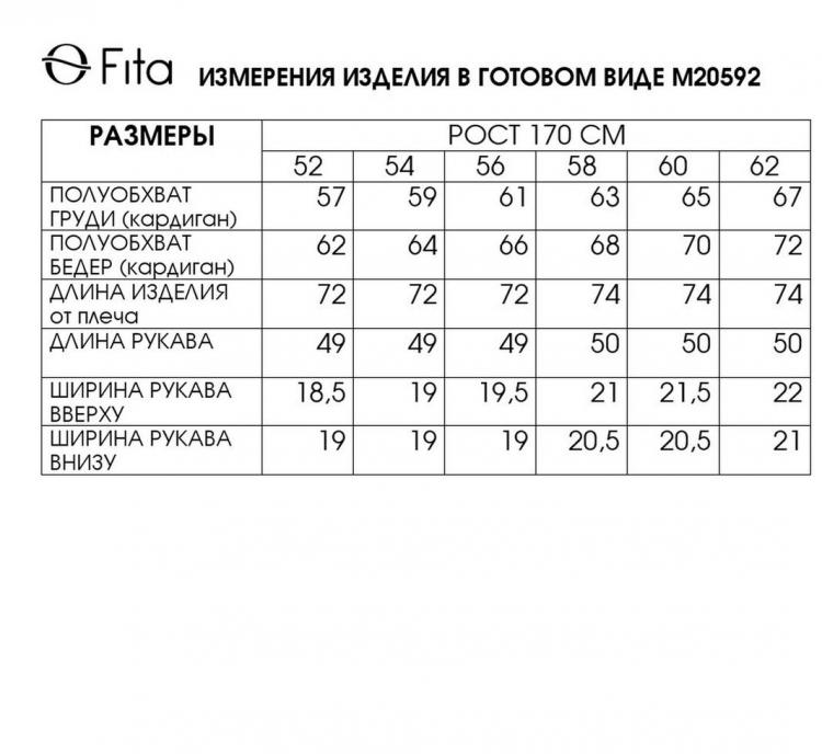 Кардиган женский, прямого силуэта, отрезной на полочке по линии бедер. Верхняя передняя часть выполнена из полоски с люрексом. Застежка центральная на петли-пуговицы, с планкой. Нагрудные вытачки. Горловина круглая,обработана отрезной планкой. Рукав втачной, одношовный 3-4. Спинка с отрезной кокеткой. По спинке сборка. Боковые швы с высокими разрезами. Длина по спинке 52-56 110см, длина рукава 45см, длина по спинке 58-62 113см, длина рукава 46см. Реальные замеры изделия 52 ог-114см, от-116см, об-120см, 54 ог-118 см, от-120см, об-124 см, 56 ог-122 см, от-124 см, об-128 см, 58 ог-126см, от-128. об-132, 60 ог-130см, от-132см, об-136см. 62 ог-134, от-136см, об-140см.