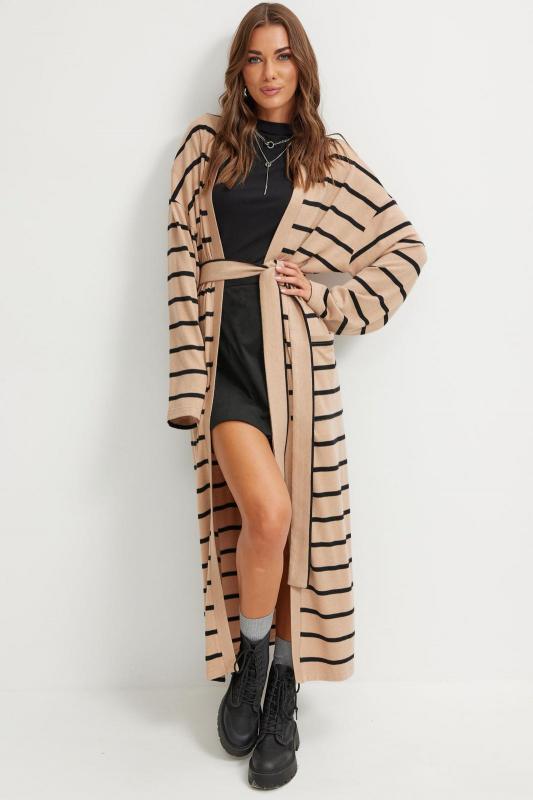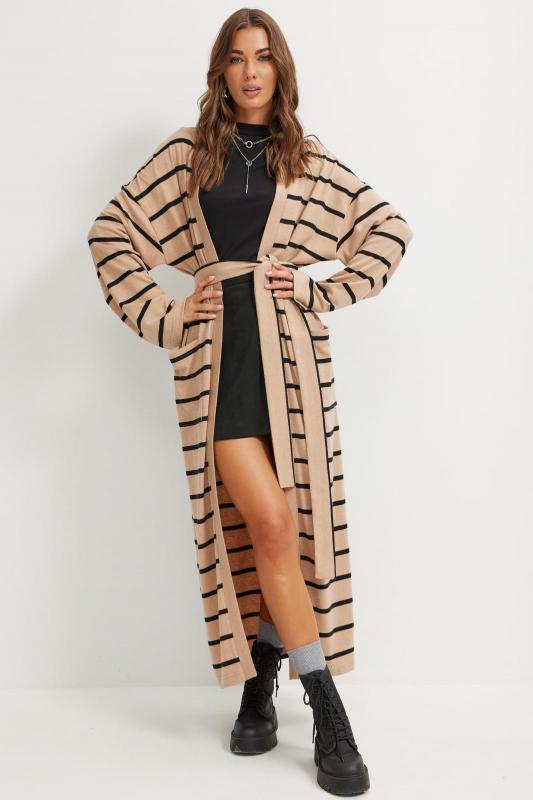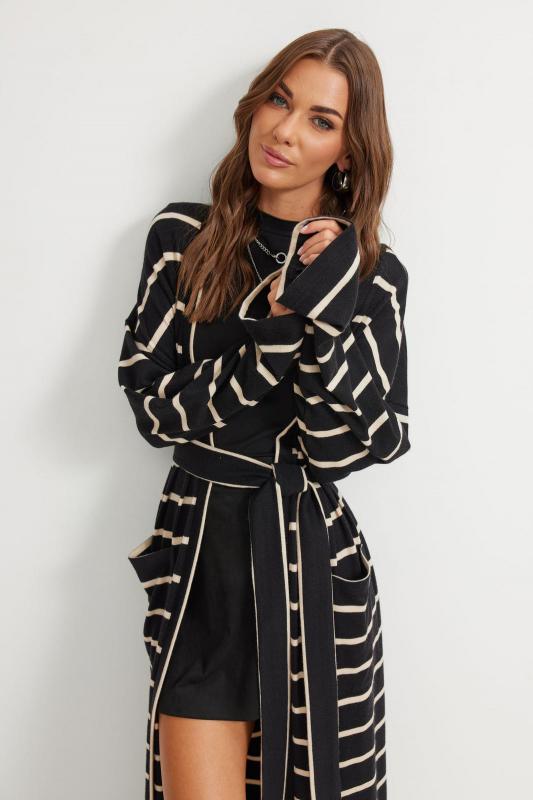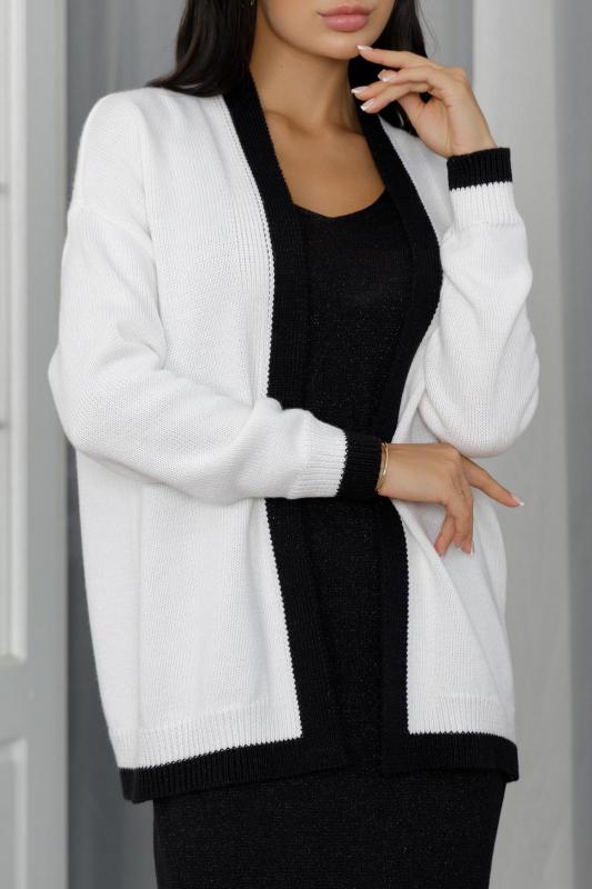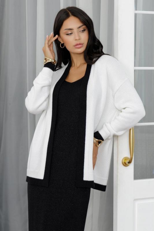 Уютный трикотажный кардиган на запах, длиной миди с длинным рукавом. Кардиган отделан контрасными планками, создающими вертикаль стройности. Свободу движения обеспечивают разрезы в боковых швах. Мягкий съемный пояс дополнит образ. Кардиган может быть предложен со светлым гольфом из трикотадного полотна С117.
