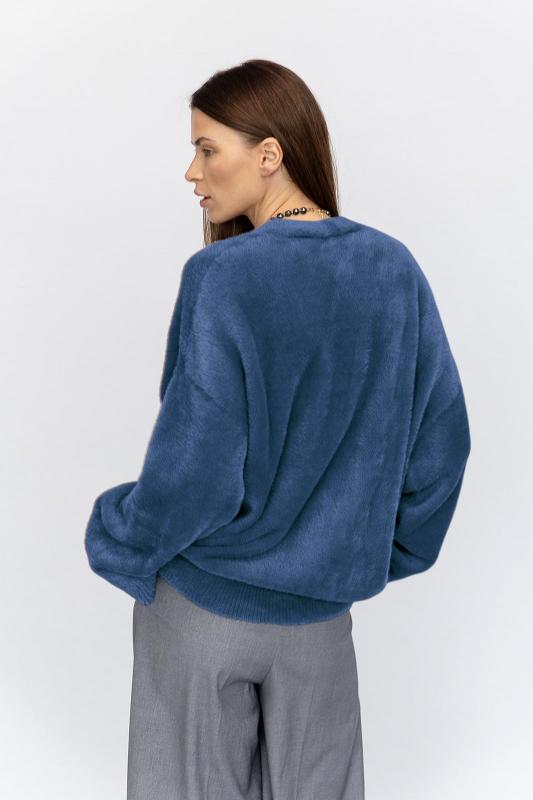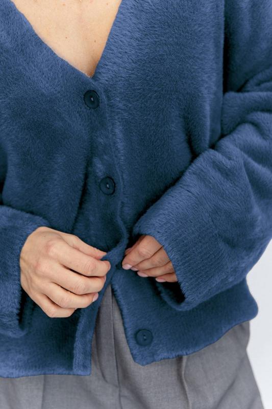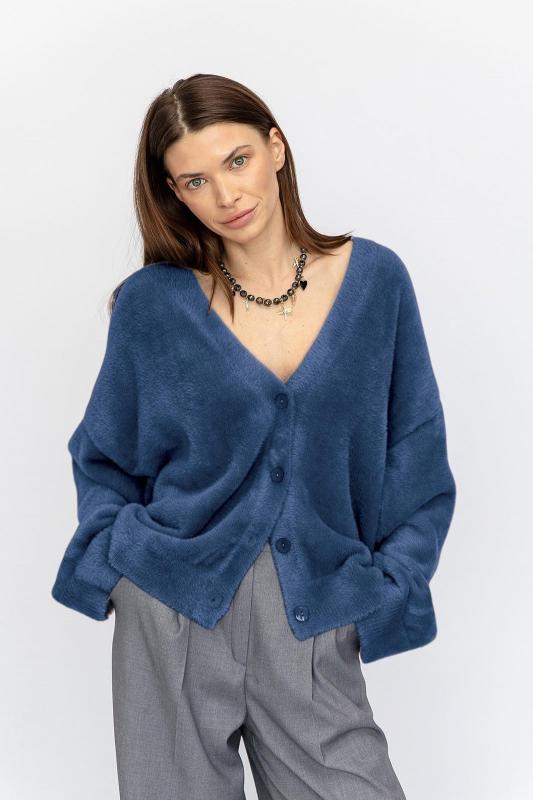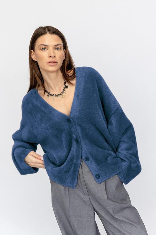 Кардиган прямого силуэта. На переде накладные карманы, карманы прямоугольной формы, настрочены под наклоном. рукав длиной до запястья. Застежка на 4 петли-пуговицы. Длина спинки-87,5см, длина рукава-47,5см, длина плеча-19см. Параметры модели: обхват груди-98см, обхват бедер-110см, размер кардигана на модели 52.