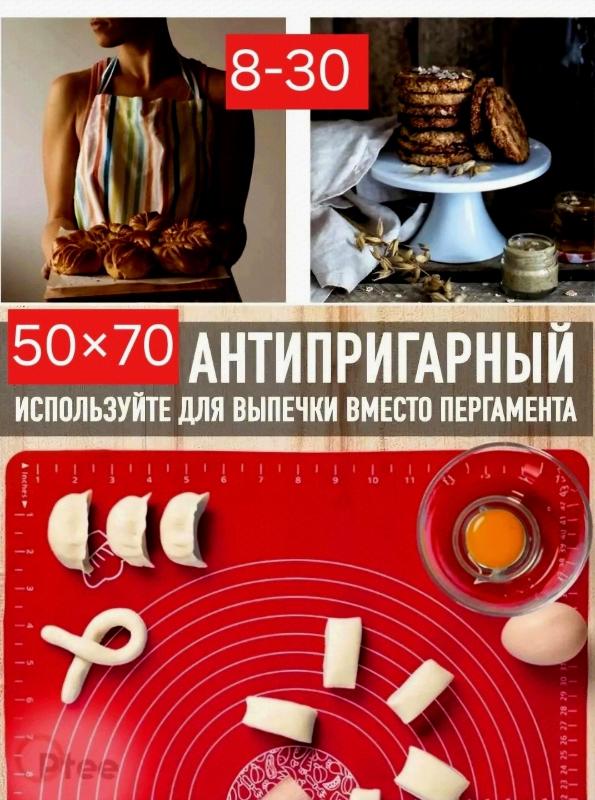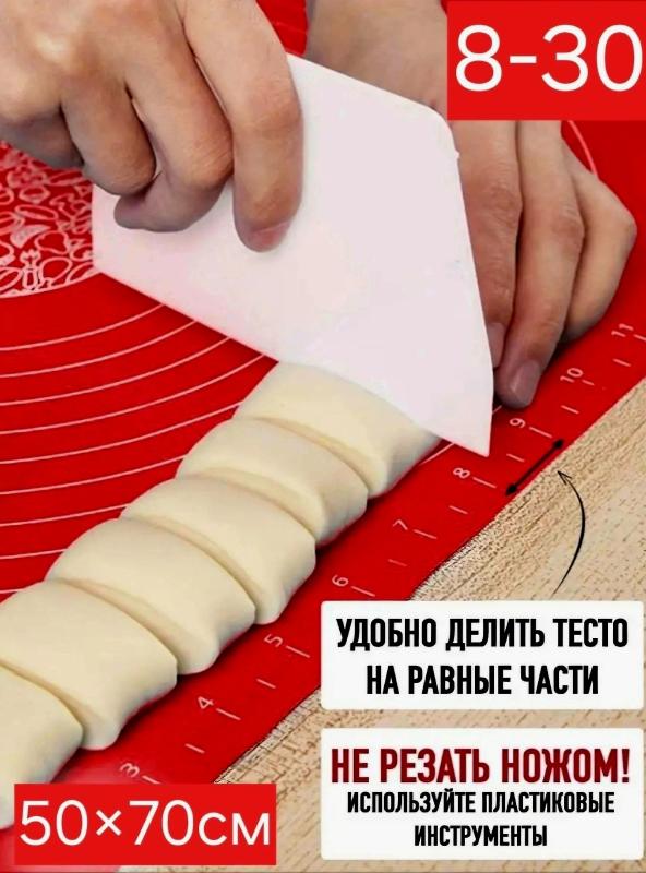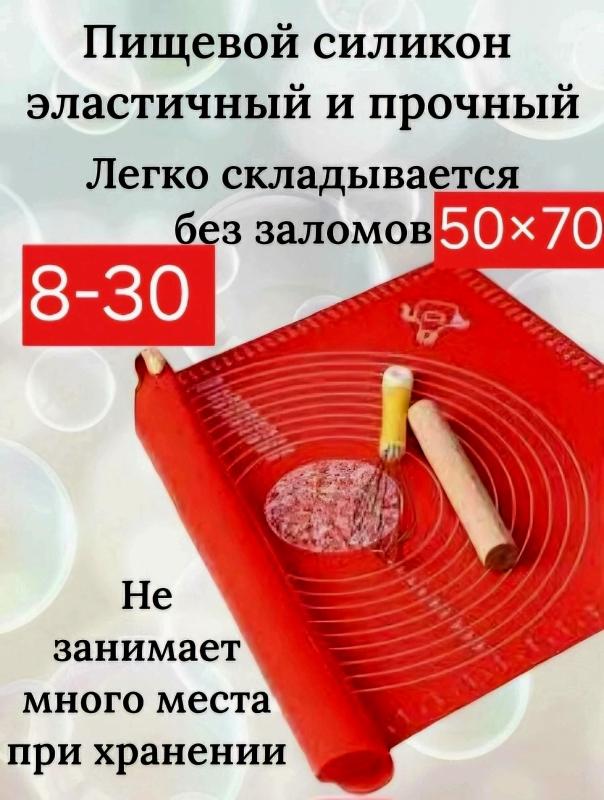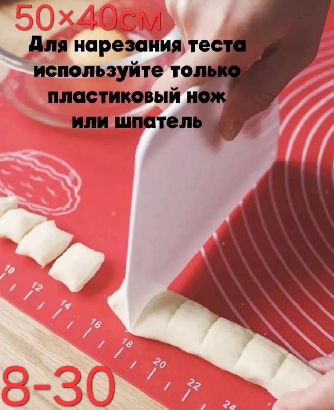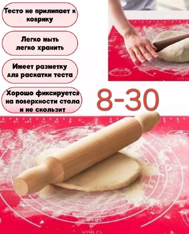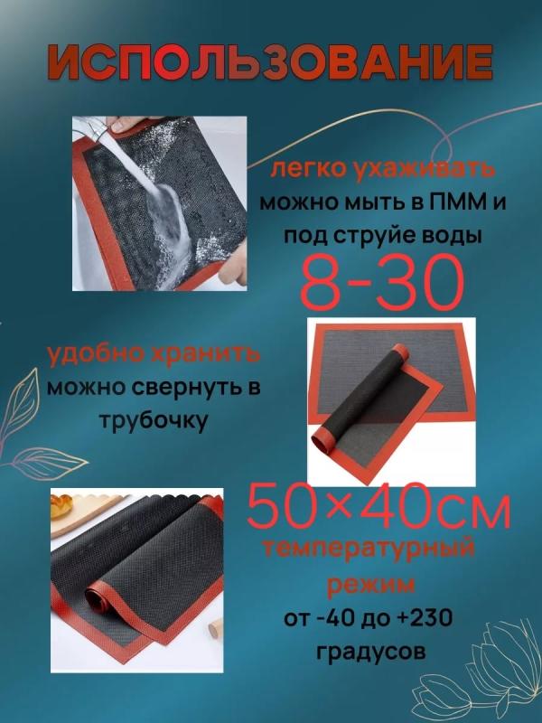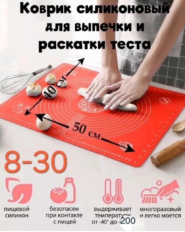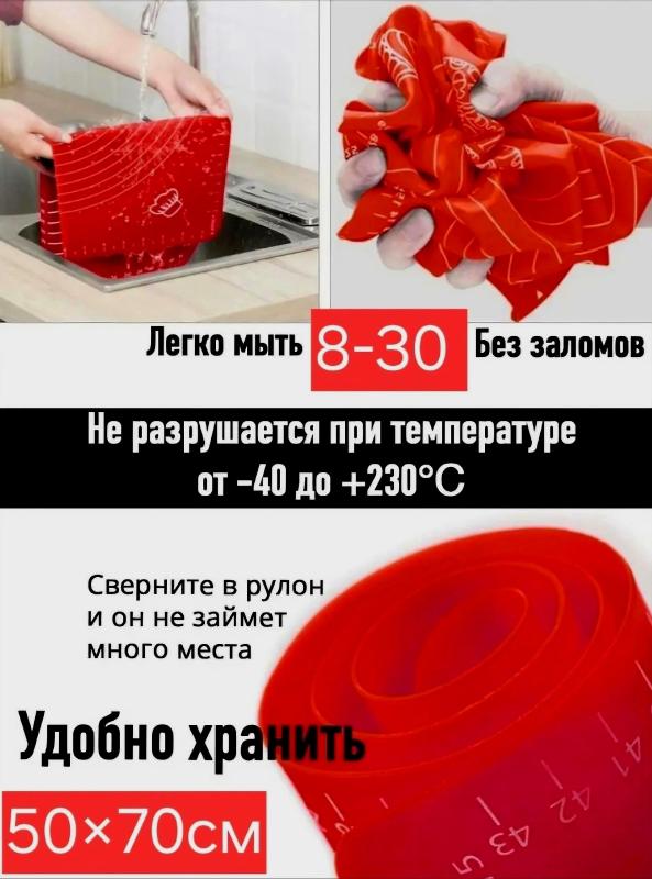 Материал: Силикон — гибкий и прочный материал, а специальная поверхность уменьшает риск прилипания теста к поверхности. Температурный режим составляет от -40 до +230 °C. Простота ухода: После использования коврик достаточно промыть с небольшим количеством моющего средства в тёплой или холодной воде. Удобное хранение: Изделие можно свернуть в трубочку и легко разместить даже в самом компактном шкафу