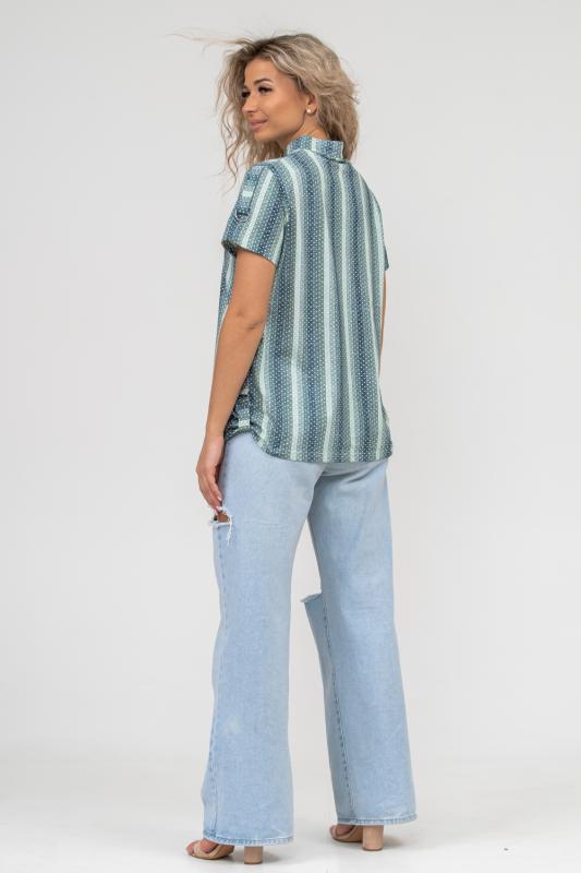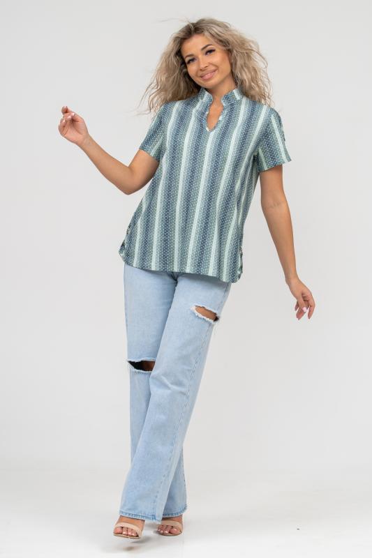 Женская туника-рубашка из 100% хлопчатобумажного полотна, сочетающая в себе всеми любимую полоску и не выходящий из моды горошек. Горловина с V - образным вырезом и воротником стойкой. Рукав и низ изделия с отделкой в виде полуколец, что делает тунику более привлекательной и по-своему красивой.