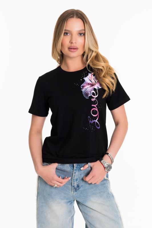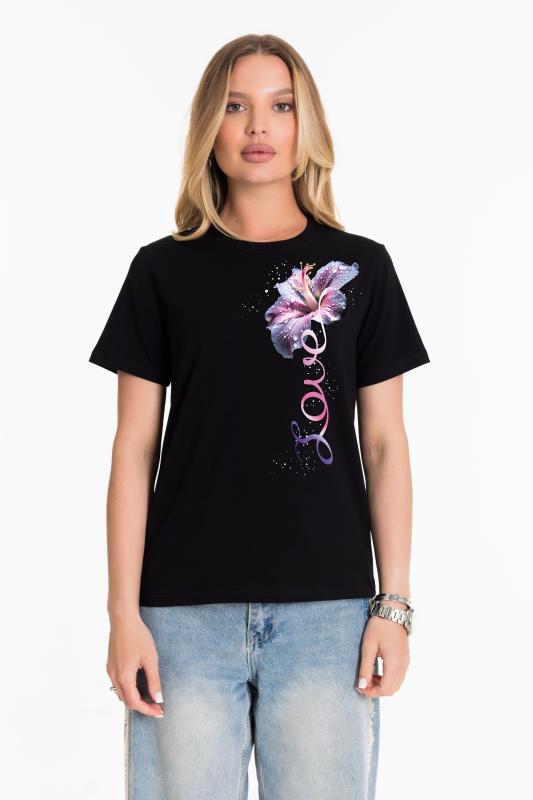 Женская футболка с принтом спереди изготовлена из хлопкового полотна с добавлением лайкры. Футболка с коротким втачным рукавом и круглым вырезом горловины, что придает ей классический стильный вид. Такая модель футболки отлично сочетается с джинсами, брюками или юбкой. Изготовленная из натуральной ткани, футболка обеспечит комфорт в течение всего дня.