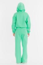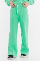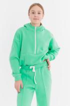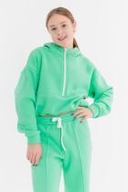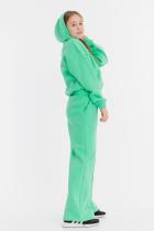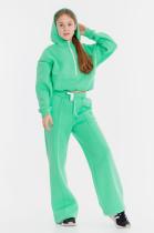 Костюм выполнен из однотонного полотна с начёсом, состоит из свободных, широких брюк и укороченной толстовки. Толстовка с капюшоном и короткой застёжкой на молнии. Линия плеча спущенная, низ толстовки на резинке. Брюки с боковыми карманами и притачным поясом на резине и шнуре, спереди отстрочены стрелки.