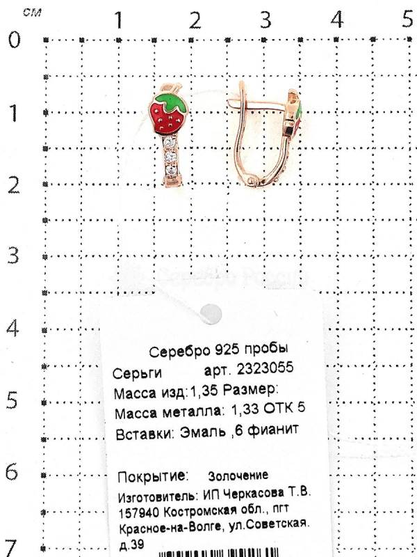Серьги детские из золочёного серебра с эмалью и фианитами - Клубнички 2323055